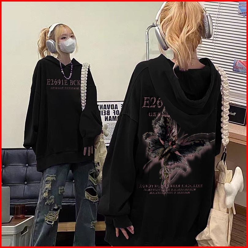 Forteid Oversize Hoodie Wanita Korean Style Oversize Hoodie Sweater Cetakan Huruf Kupu-kupu Baju Wanita Kekinian Baju