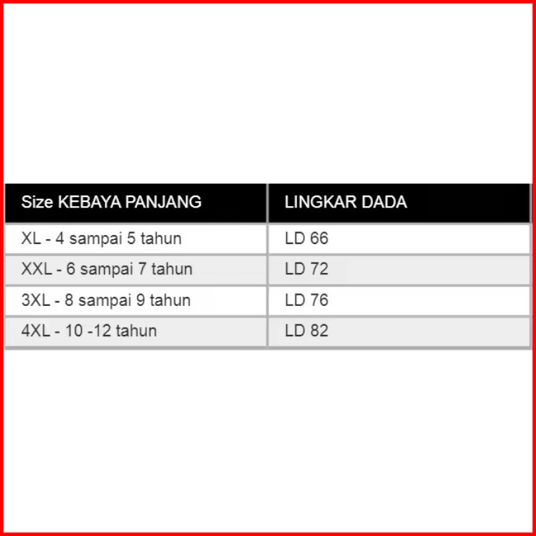 XL 4-5 tahun, XXL 6-7 tahun, XXXL 8-9 tahun, 4L 10-11 tahun, 5L 12-14 tahun
