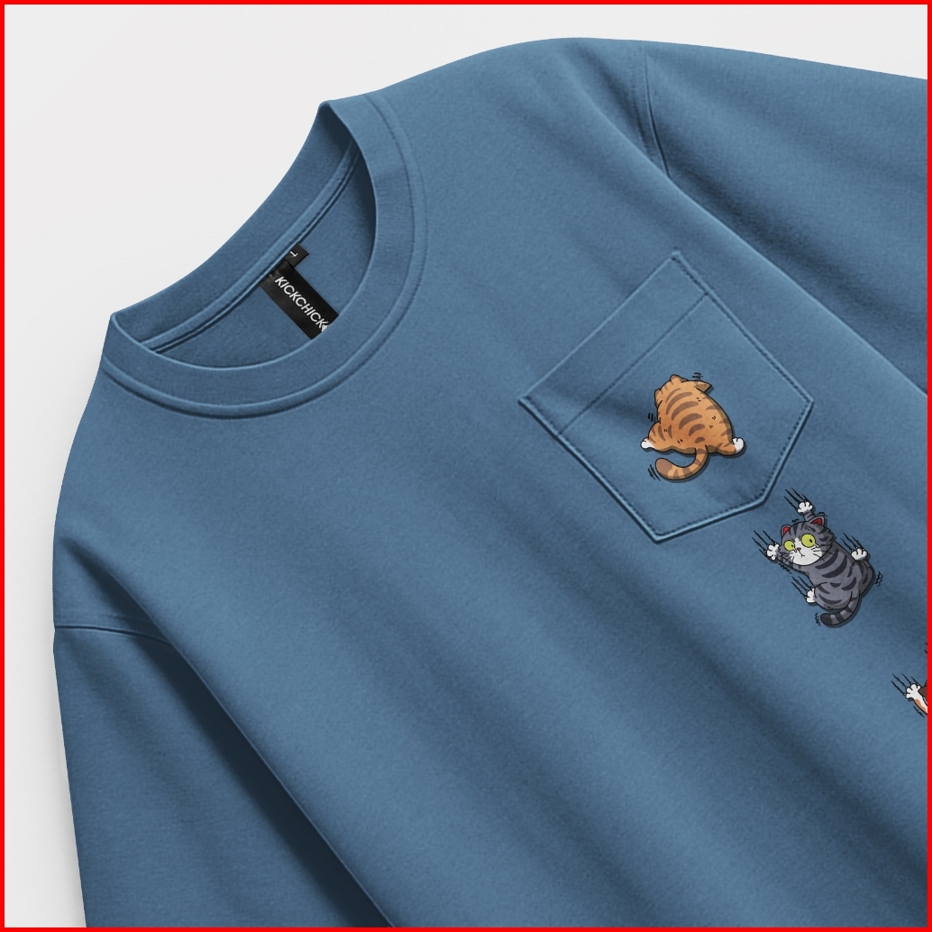 Kickchick Tshirt Oversize Pocket Sliding Cat Steel Blue V1 I Tshirt Pocket I Kcopct004