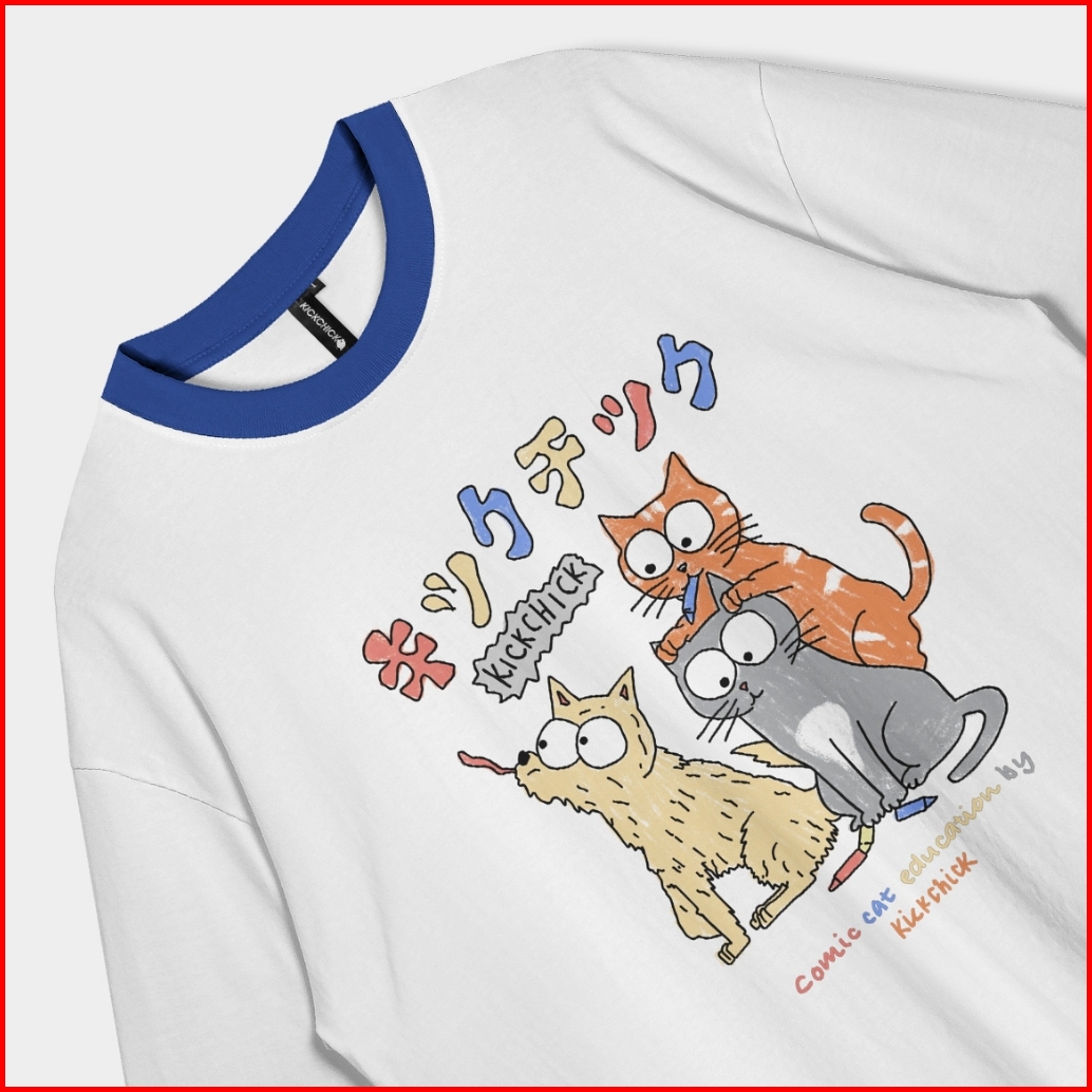 Kickchick Oversize Ringer Tee Comic Cat White Benhur Kaos Lengan Pendek Atasan Kc-ovz-ringer007