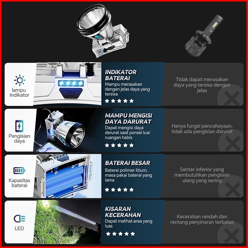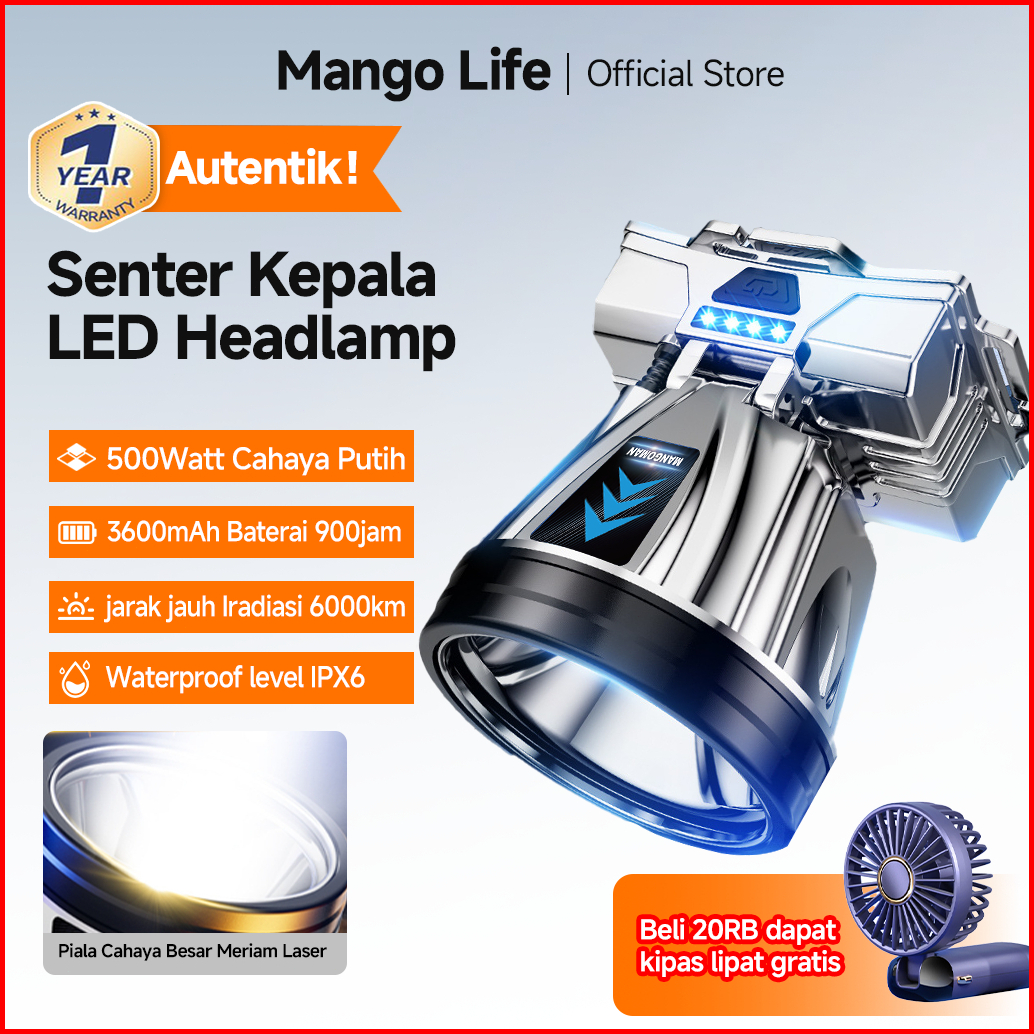 Headlamp Outdoor Senter Kepala 500 Watt Super Terang Cas Listrik 1865000mah Jarak Jauh 900000m 900jam