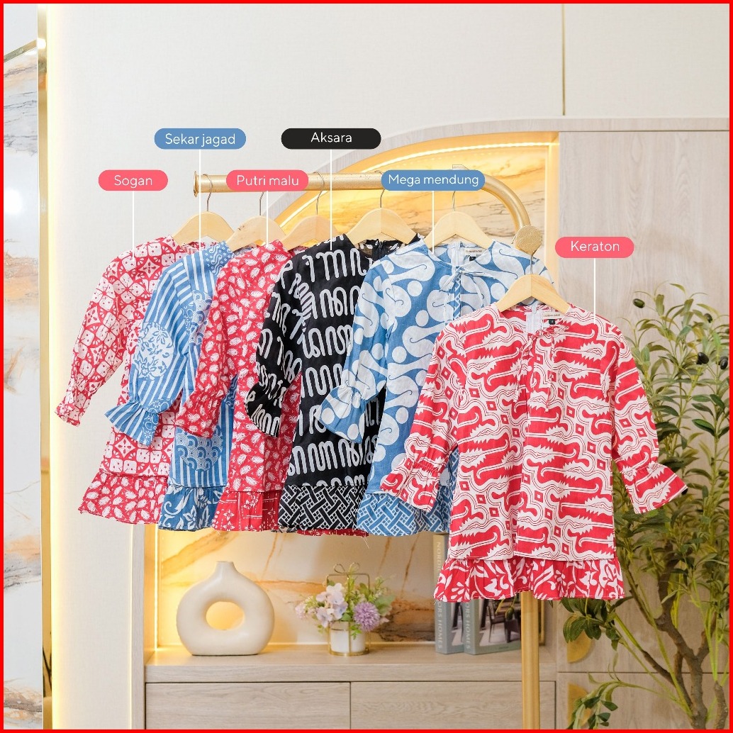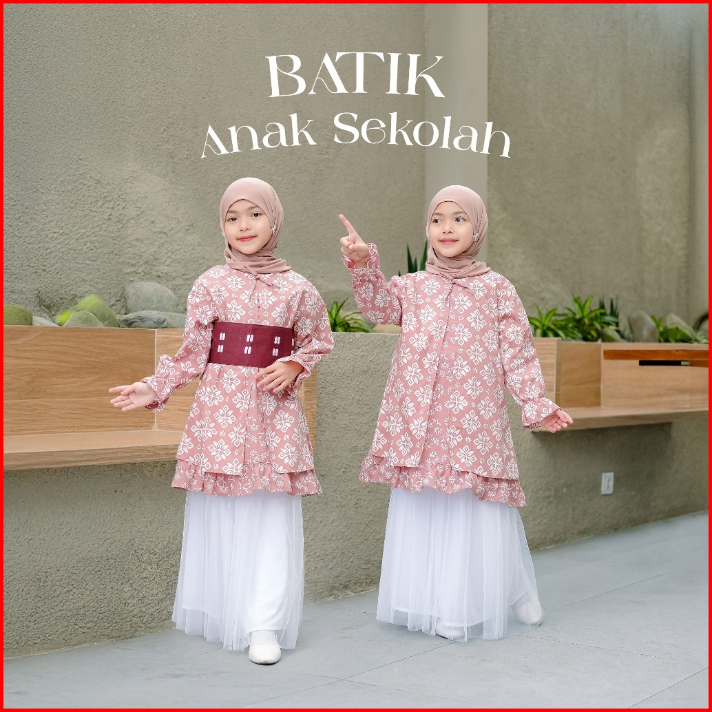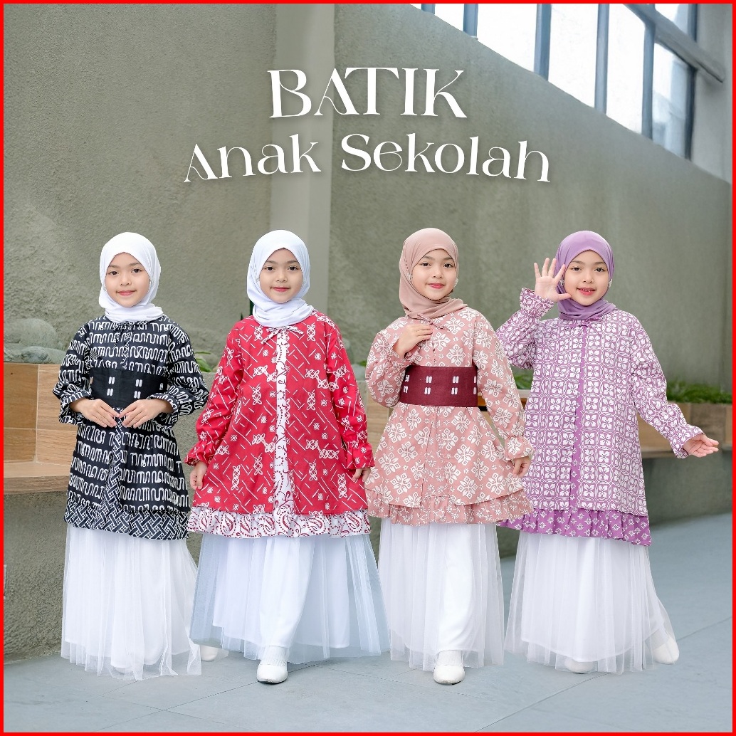 Baju Batik Kebaya Anak Sekolah Lengan Panjang 1-14tahun - Atasan Tunik Dress Hijab Merah Putih Aksara Jumput Kawung Soga