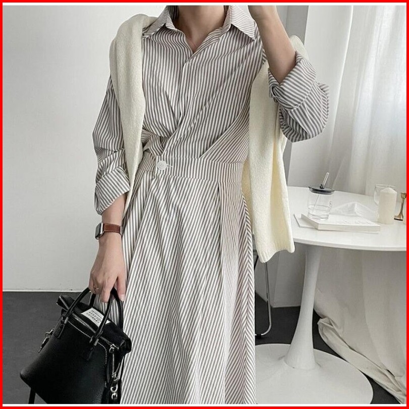 Feminafashion 99075 Gaun Wanita Motif Bergaris Rok Panjang Berkerah Lengan Panjang Gaya Kasual