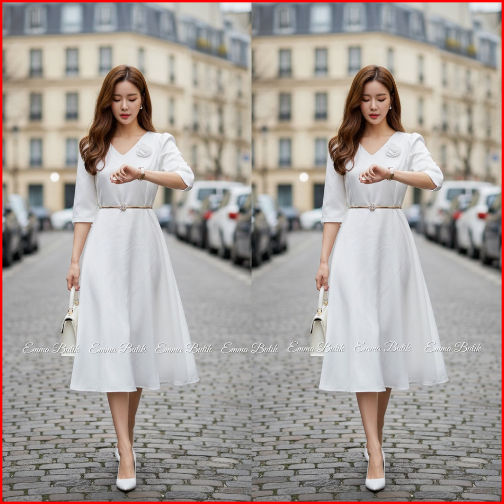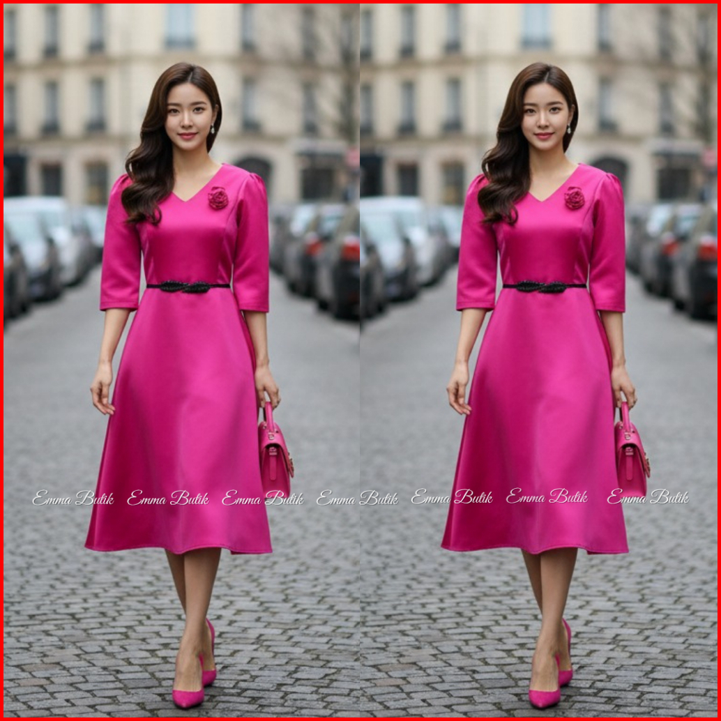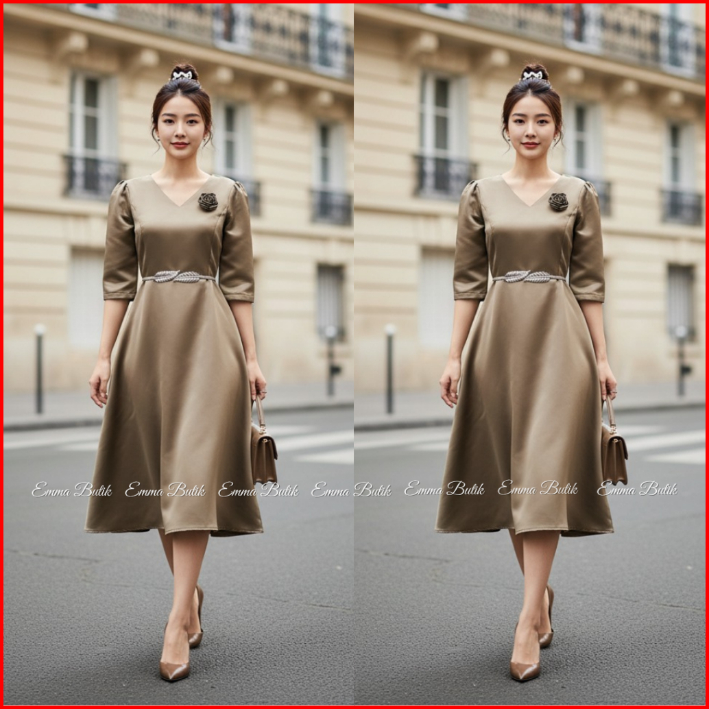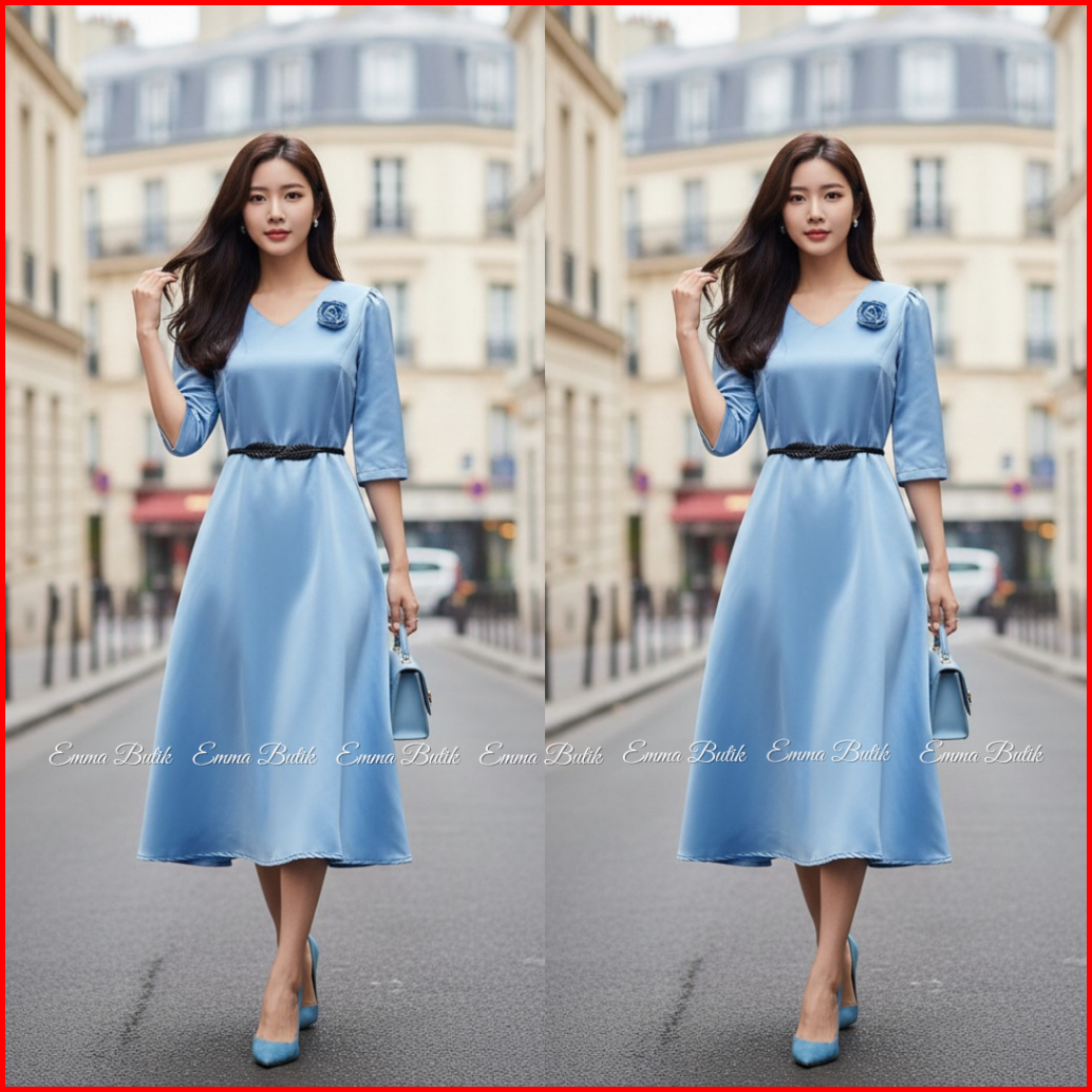Emma.butik E00640 Gaun Natal Wanita Dress Midi Pesta Kondangan Formal Sidi Wisuda V-neck Lengan 7 8