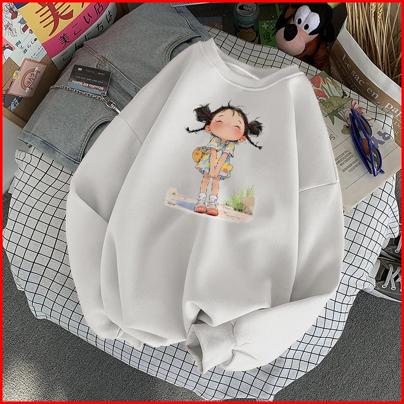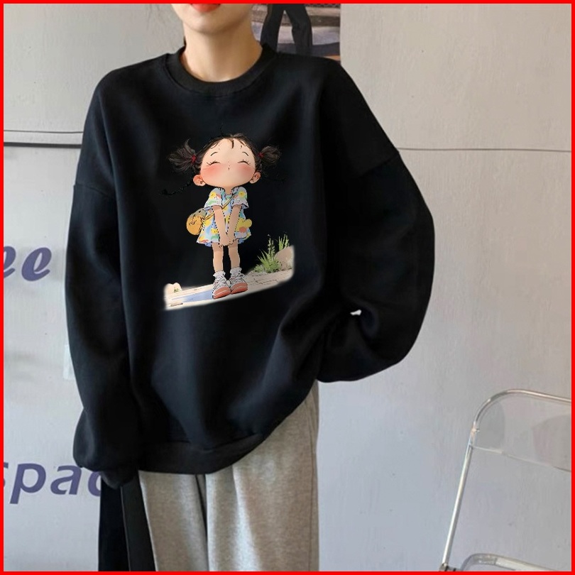 Forteid Sweater Lengan Panjang Oversized Street Style Korean Style Switer Wanita Oversize Kaos Cetakan Gadis Kartun Over