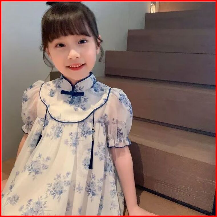 Gaun Cheongsam Anak Perempuan Motif Biru Putih Dress Chinese Style Untuk Pertunjukan Pesta 2025 Super Fairy Princess Chi