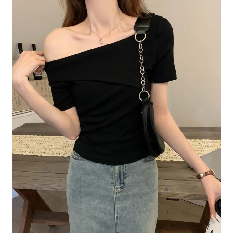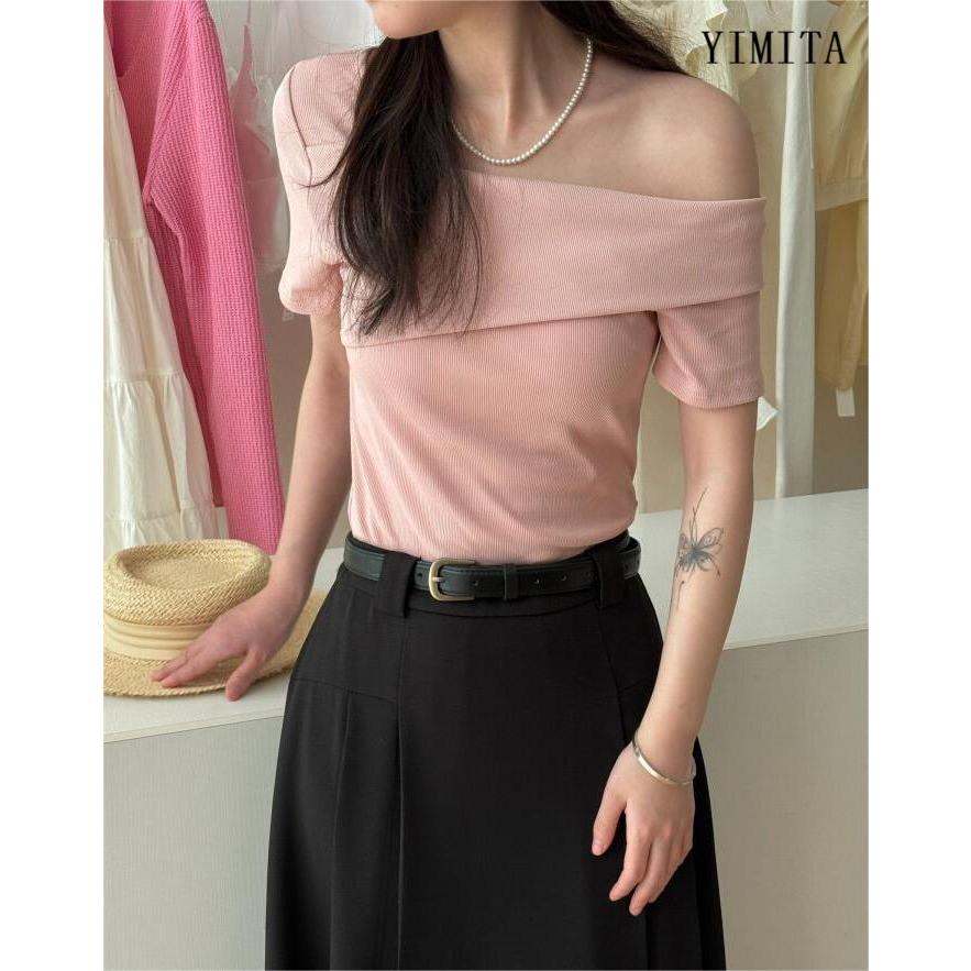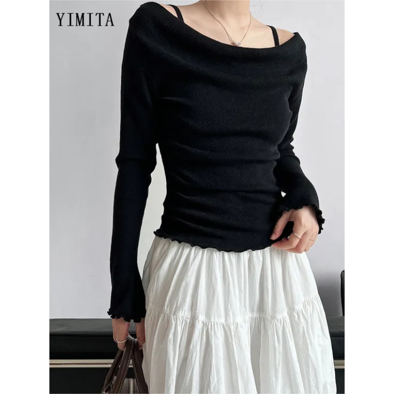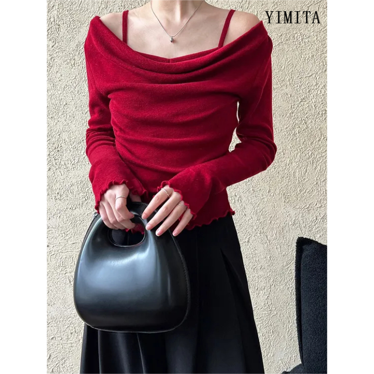 Yimita Baju Atasan Red Kemeja Crop Top Lengan Panjang Casual Cute Korean Off Shoulder Wanita Terbaru Semi Formal Top Nat