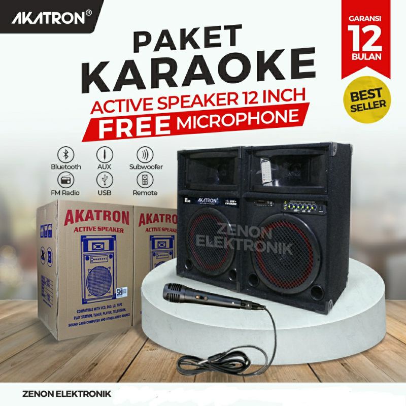 Akatron Paket Karaoke + Mic + Speaker Aktif Bluetooth 12 Inch Super Bass Subwoofer Dapat 2 Box Besar