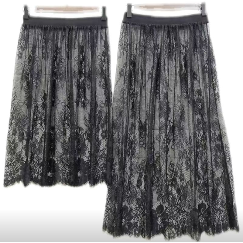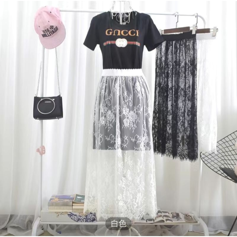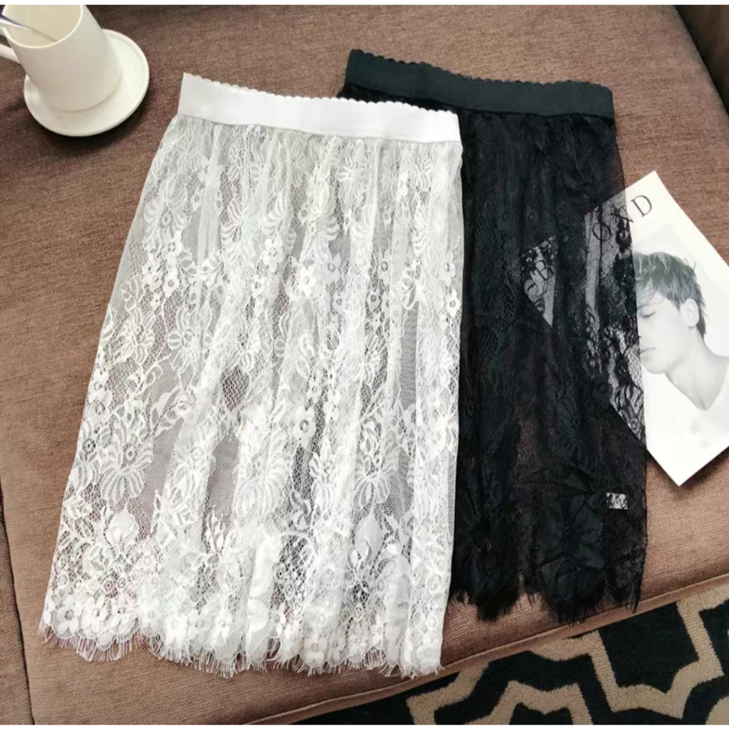 Rok Tutu Lace Motif Import/Rok Panjang Jala Renda Seksi Wanita/Rok Midi Hitam Putih Tulle Transparan A-Line Pinggang Tin