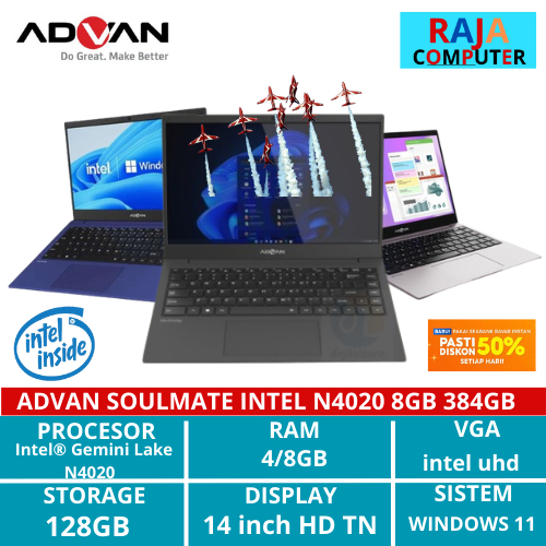 (Gratis Ongkir) Advan Laptop Soulmate T Celeron N4020 8gb GB 128GB 256GB 14" W11 UPGRATABLE
