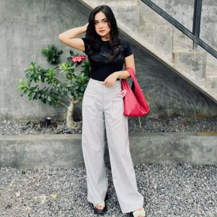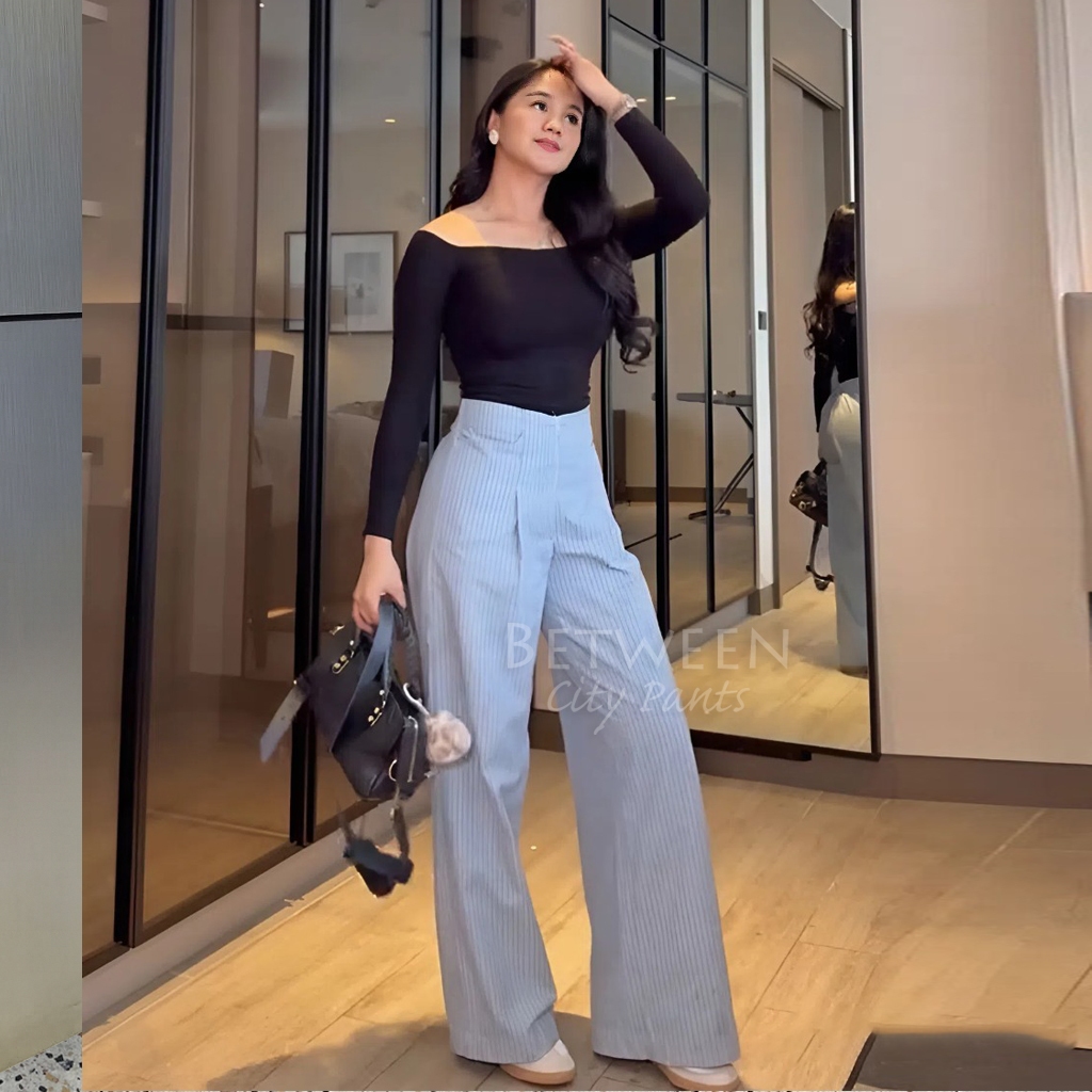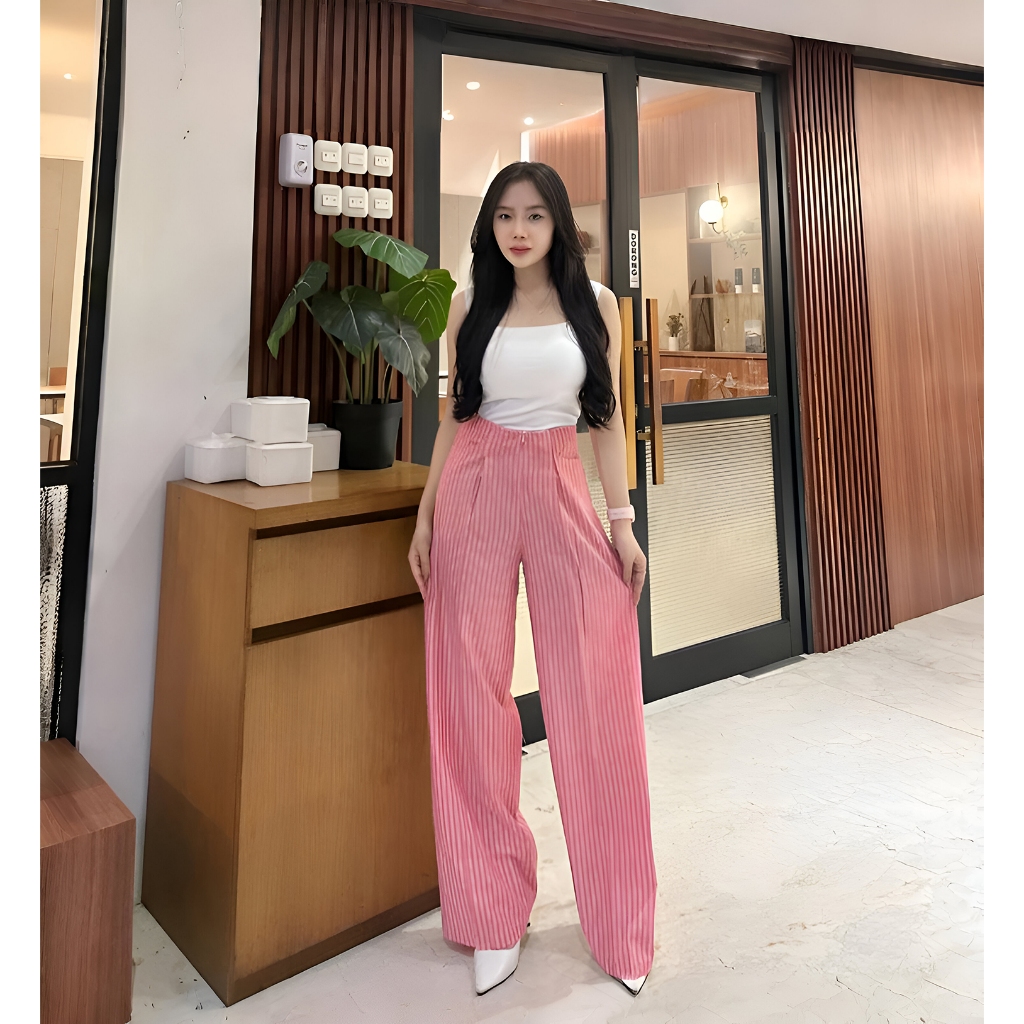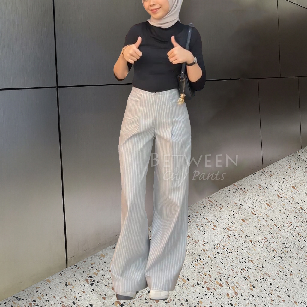 Betweeen - Stripe Pants Celana Panjang Wanita Wideleg City Pants Motif Salur Belakang Karet Celana Kulot Celana Kerja Ha