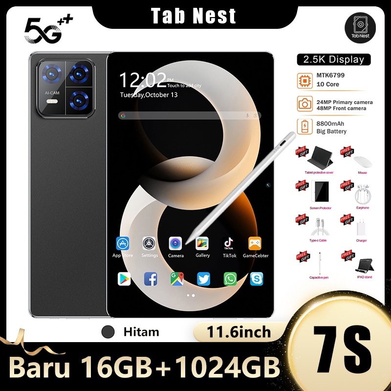 Tablet Android Pad 7S, RAM 16GB + 1024GB ROM, 5G Dual SIM, Wifi, Tablet PC untuk Belajar & Hiburan
