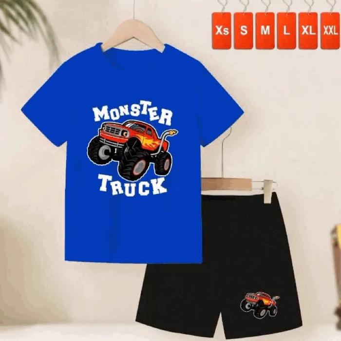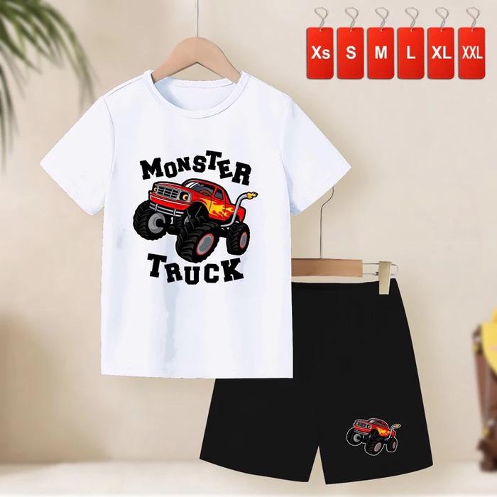 Promo SETELAN KAOS ANAK LAKI LAKI PREMIUM USIA 2-15 THN - Set PUTIH MONSTER TRUCK Xs 1/2thn Keren