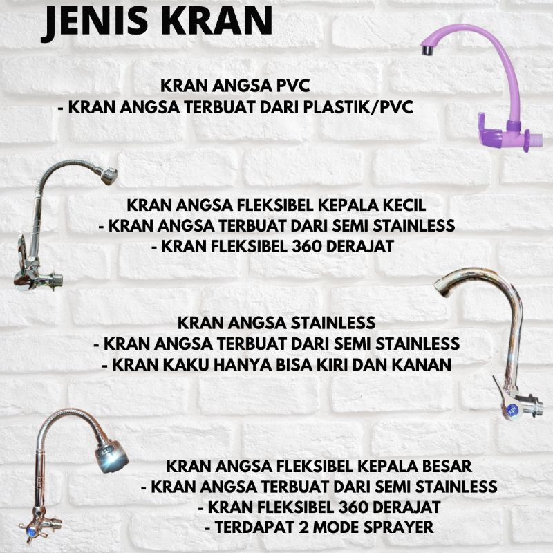 TANPA KRAN, KRAN ANGSA PVC, KRAN ANGSA STAINLESS, KRAN FLEKSIBEL KECIL, KRAN FLEKSIBEL BESAR