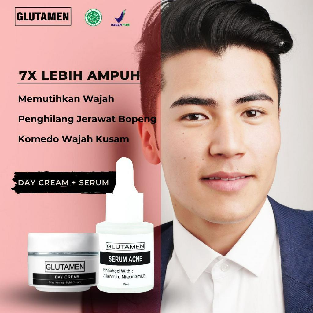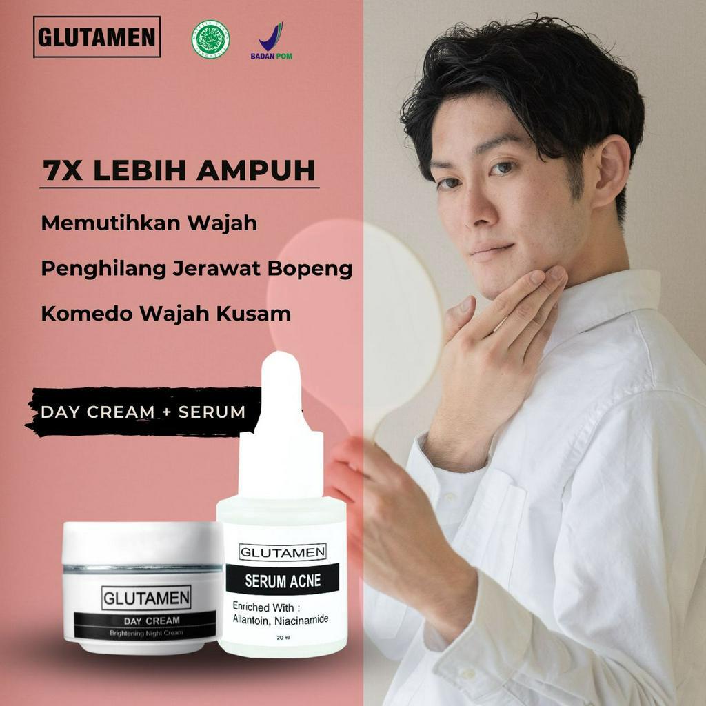 Glutamen Skincare Paket 2in1 Serum Acne Cream Siang Penghilang Jerawat Dan Beruntusan pada Pria BPOM