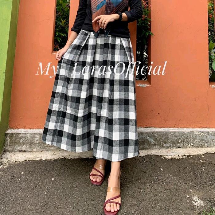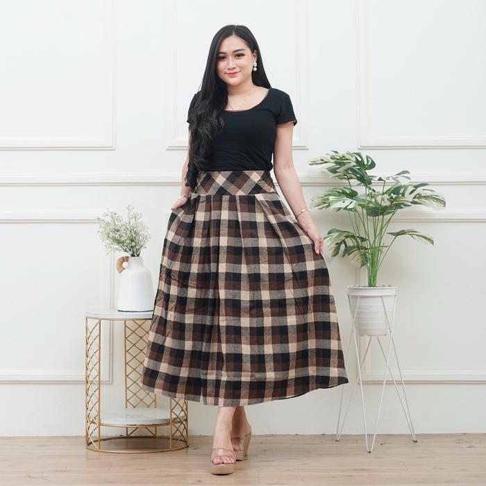 Rok Saja Midi 7/9 Flanel Kotak - Wanita Dewasa Casual Rempel - Navy Biru, All Size