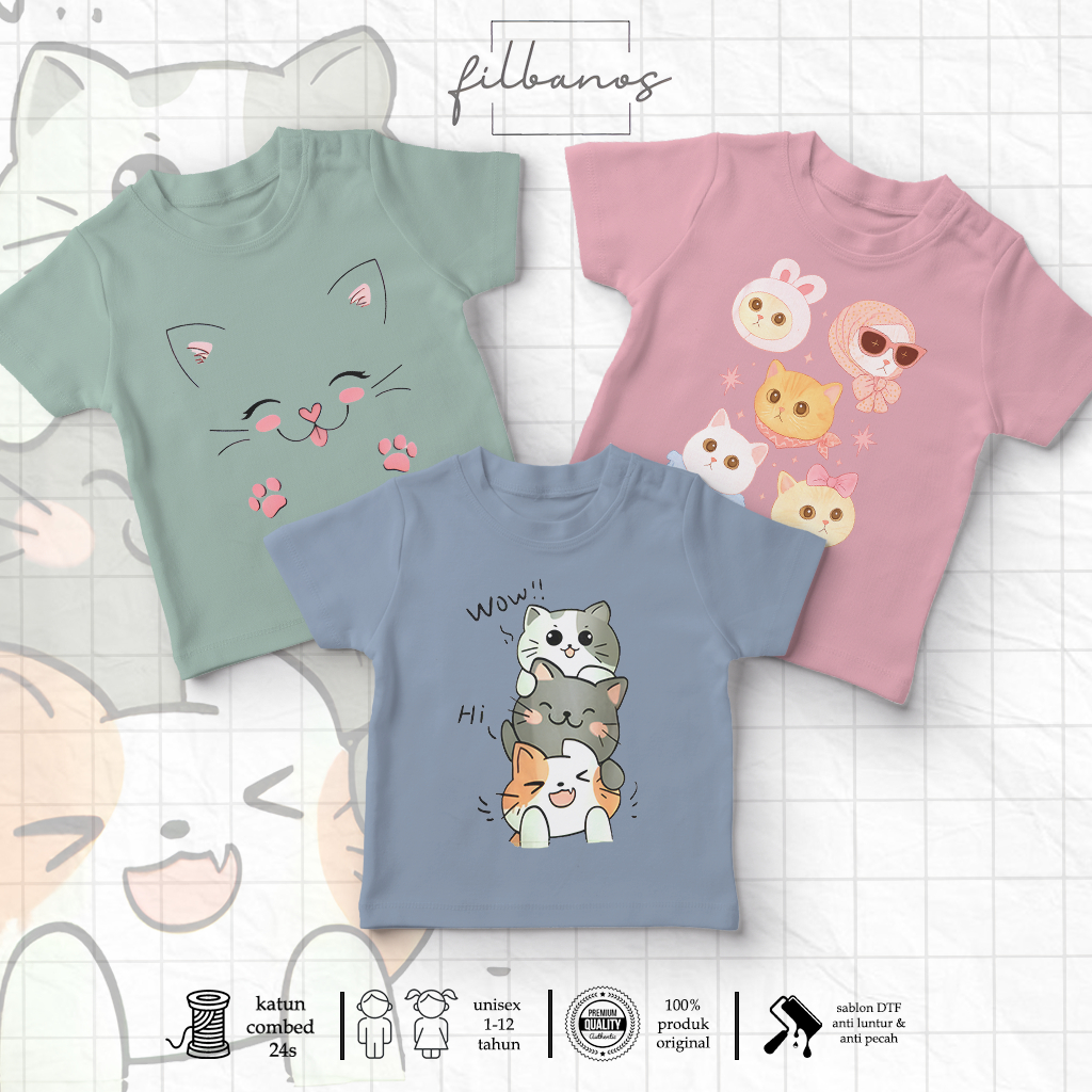Baju Kaos Anak Filbanos - Baju Atasan Kaos Anak Perempuan Cewek Kucing Premium 1-12 Tahun (100% Katun Combed 24s)