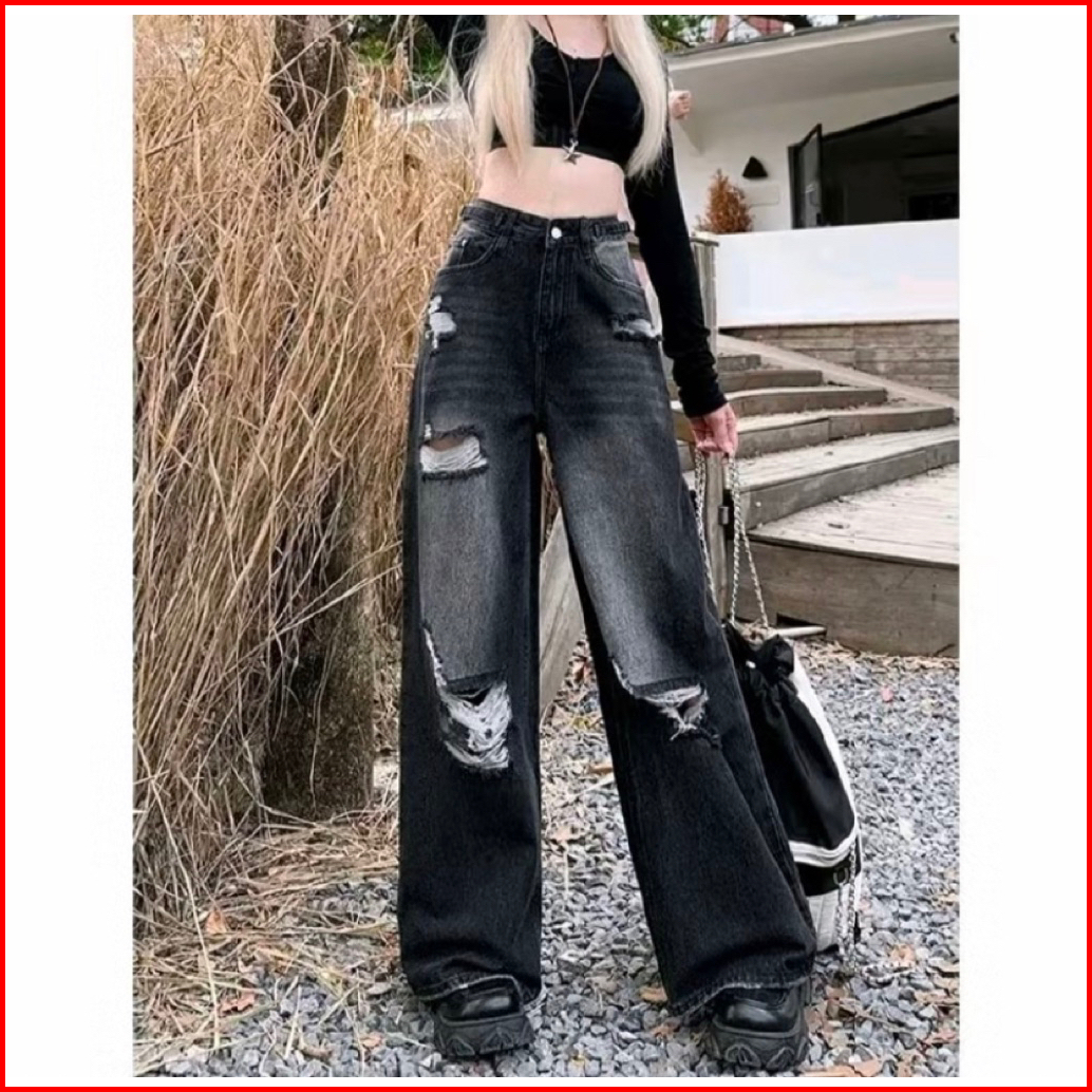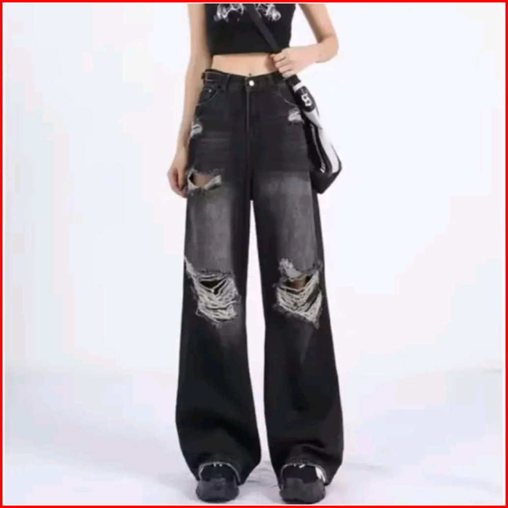 Highwaist Celana Jeans Baggy Losse Sobek Lutut