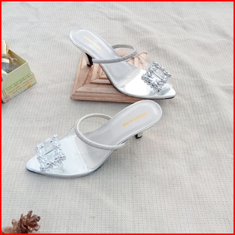 Mqstars Sepatu Heel Wanita Transparant Hak Lancip 5cm Kekiniann Sendal Pesta Kaca Bening Terbaru