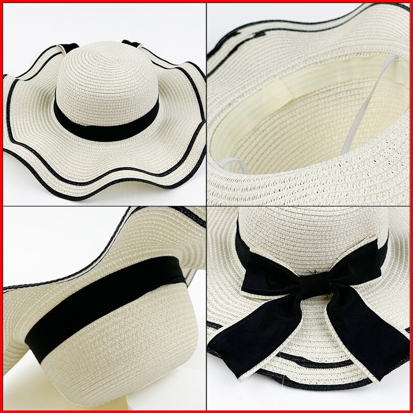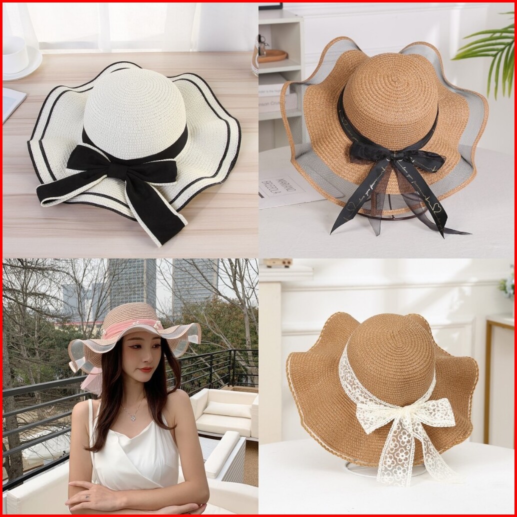 Topi Pantai Wanita Gelombang Topi Bundar Aksen Pita Cantik Topi Anti Uv Topi Pantai Pita Topi Anti Matahari Topi Visor B