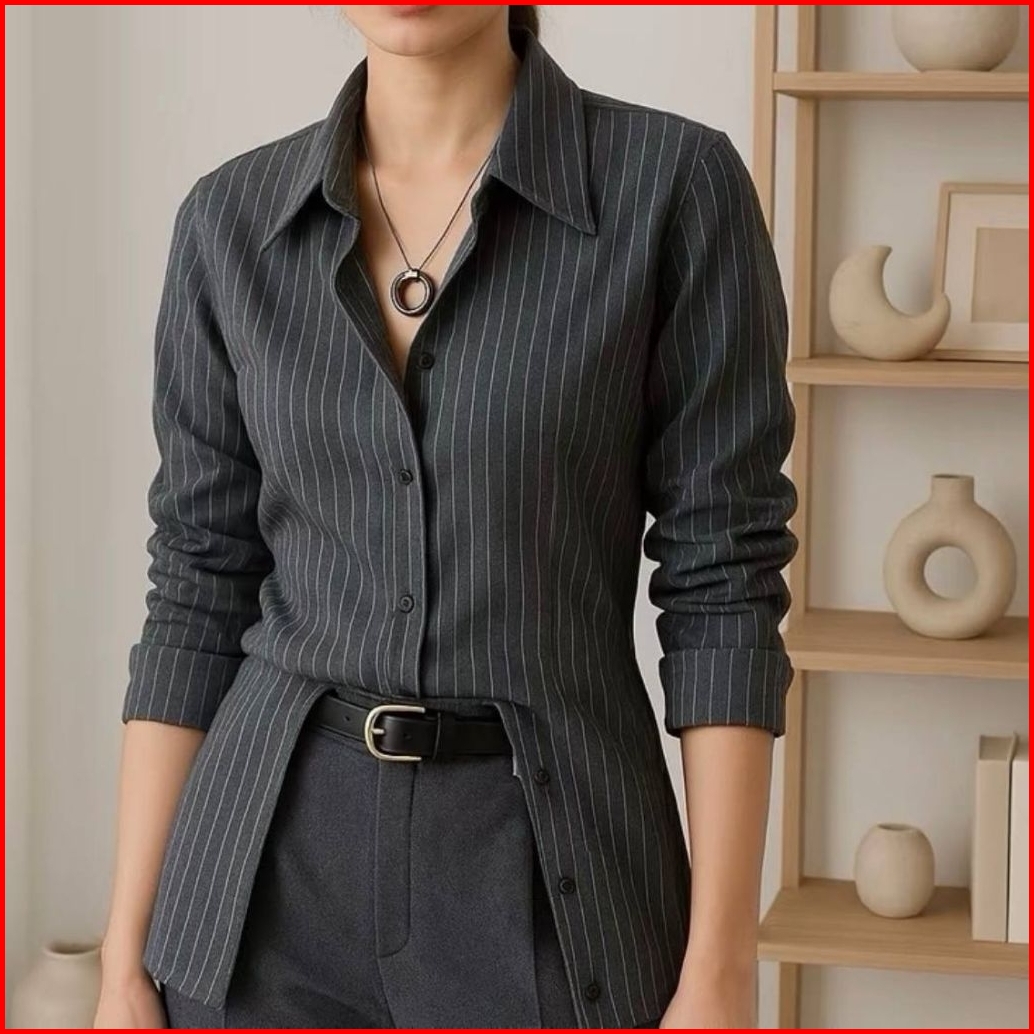 Av-id Luna Stripe Kemeja Fitted Salur Basic - Atasan Wanita Lengan Panjang Tali Belakang Bahan Adem