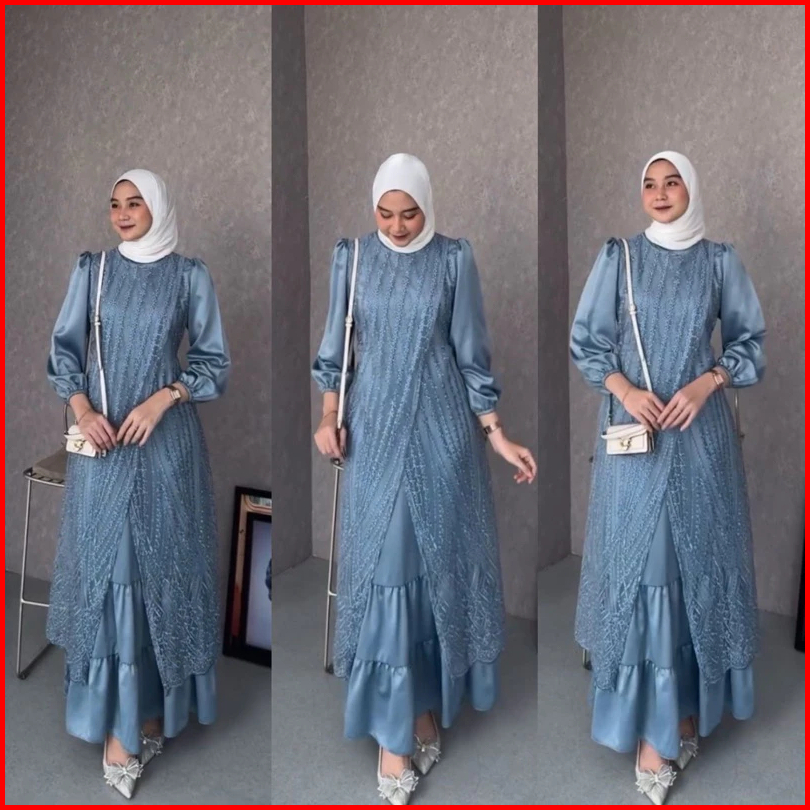 Fuji Dress Brukat Tille Premium Pesta Lebaran Gamis Pesta Mewah Bahan Maxmara Mix Brokat Timbul