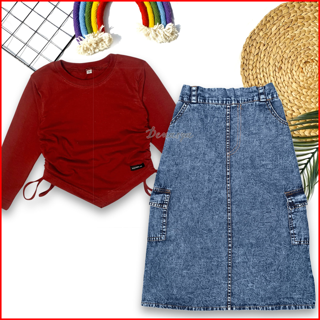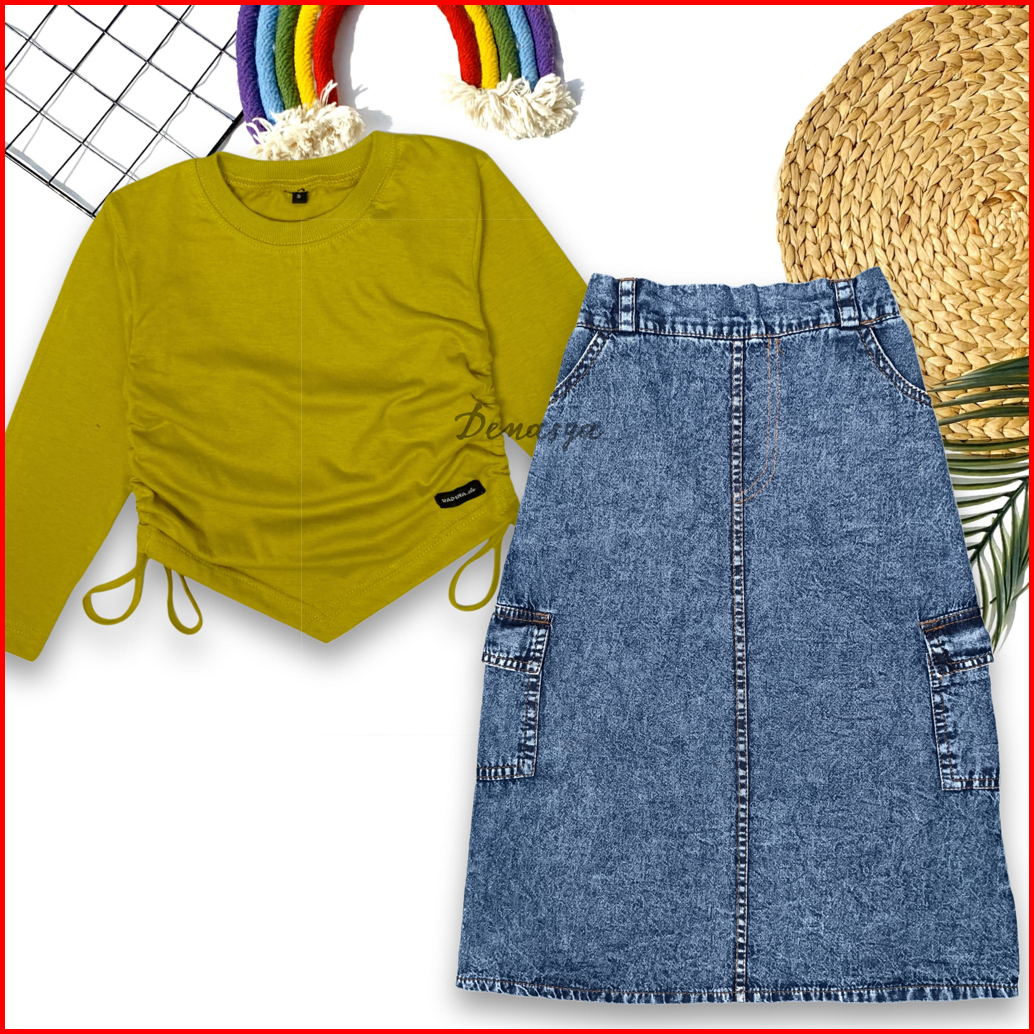 Fashion Style Anak Perempuan Setelan Rok Panjang Cargo Jeans Snowblue Kaos Croptop Serut Usia 2-12 Tahun
