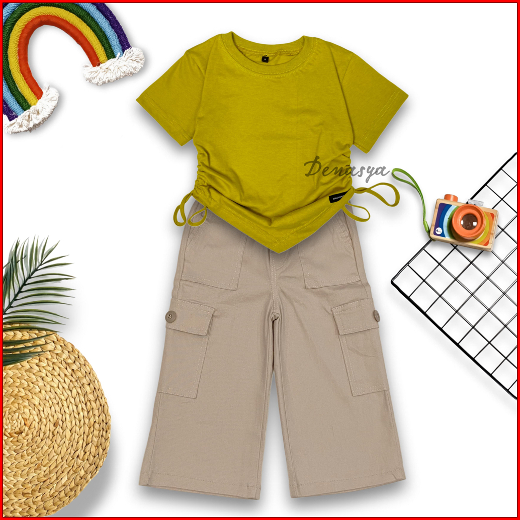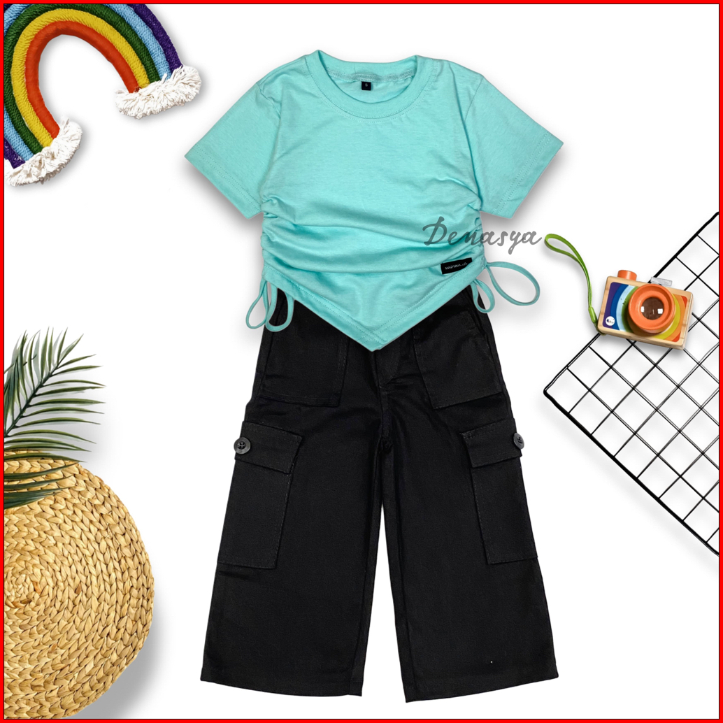 Fashion Anak Perempuan Hits Setelan Kulot Cargo Katun Kekinian Atasan Kaos Serut Croptop Anak Usia 2-12 Tahun