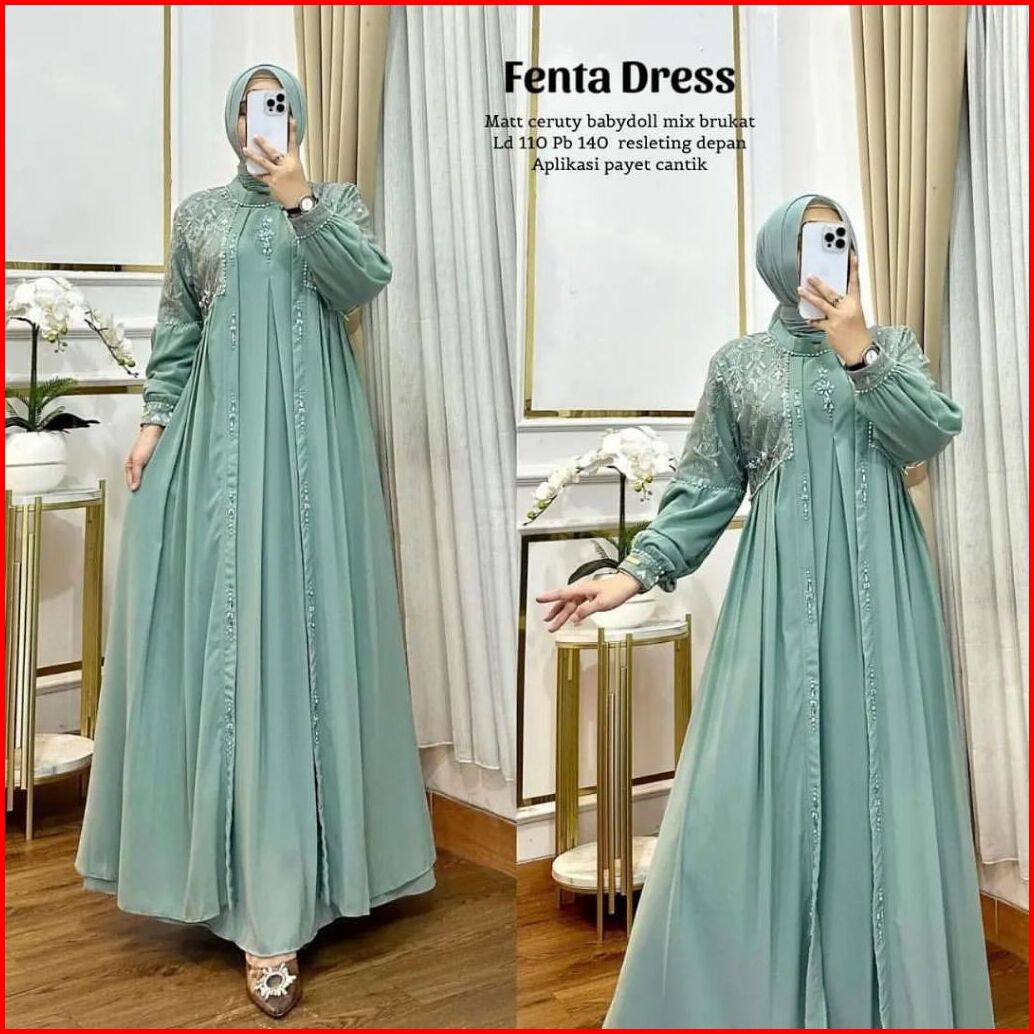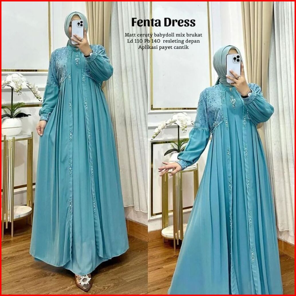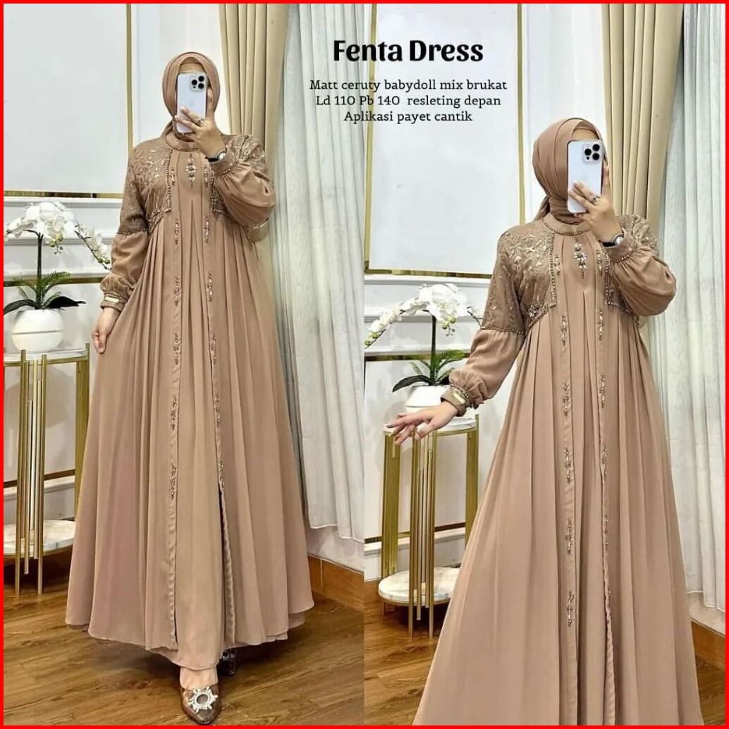 Fenta Dress Gamis Ceruty Babydoll Full Puring Mix Brukat Aksen Payet Mutiara Gamis Kondangan Mewah Gamis Muslim Terbaru