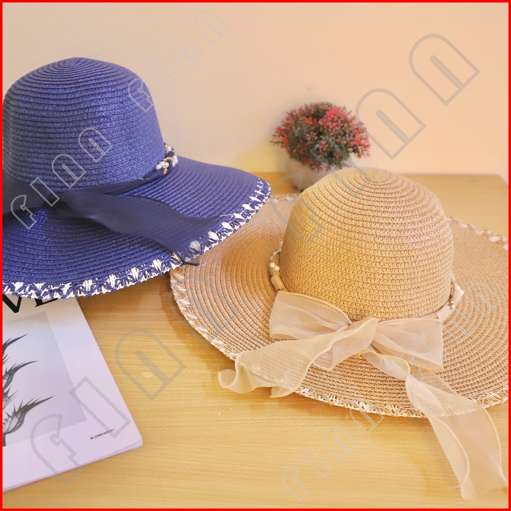 Finn - Topi Rajut Pantai Aksen Mutiara Pita Beach Hat Topi Pantai Visor Lebar