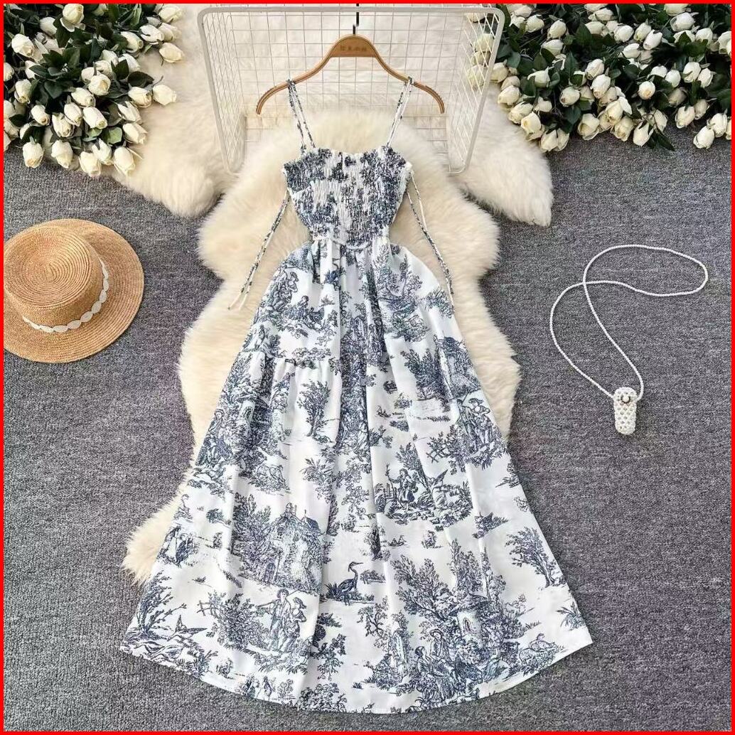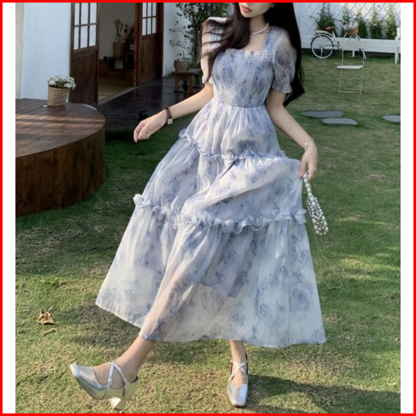 Dress Biru Princess Midi Dress Terbaru 2025 Korean Style Elegant Lengan Pendek Dress Wanita Kekinian Lengan Balon Fairy