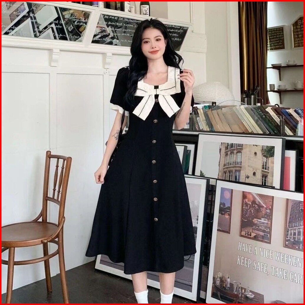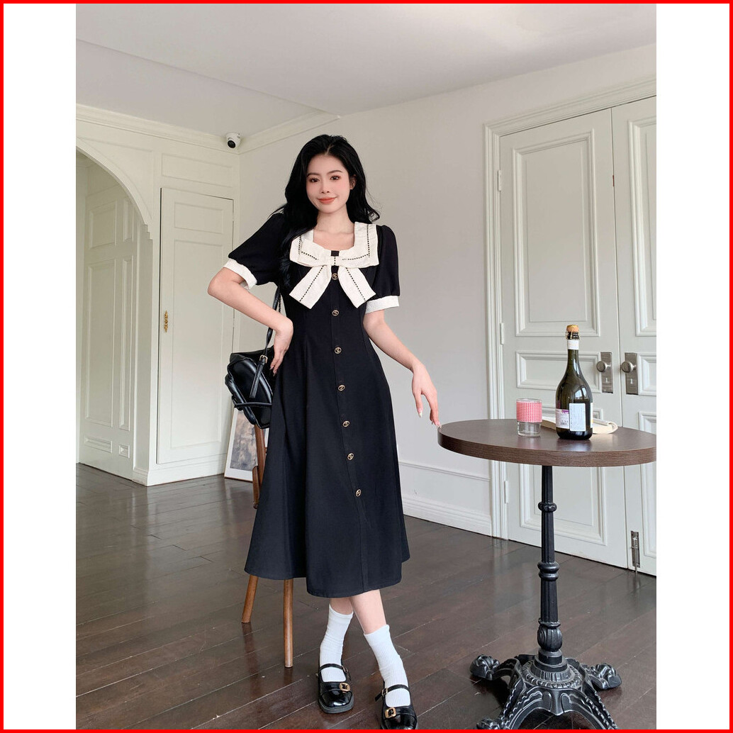 Gaun Pita Leher Persegi Gaya Hepburn Gadis Gemuk Ukuran Plus Rok Panjang Ramping Retro Hitam