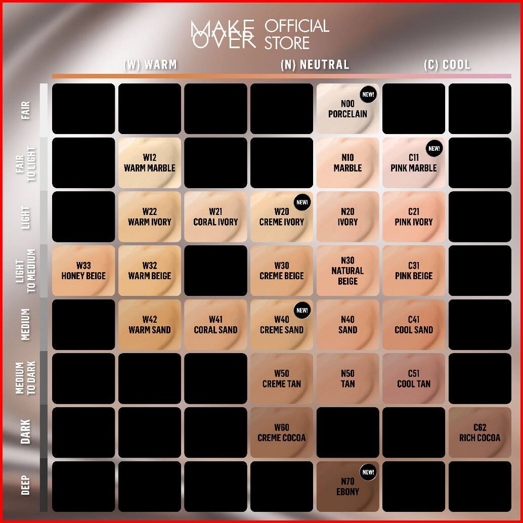 C11 Pink Marble, C21 Pink Ivory, C31 Pink Beige, C41 Cool Sand, C51 Cool Tan, C62 Rich Cocoa, N00 Porcelain, N10 Marble, N20 Ivory, N30 Nat Beige, N40 Sand, N50 Tan, N70 Ebony, W12 Warm Marble, W20 Creme Ivory, W21 Coral Ivory, W22 Warm Ivory, W30 Creme Beige, W32 Warm Beige, W33 Honey Beige, W40 Creme Sand, W41 Coral Sand, W42 Warm Sand, W50 Crème Tan, W60 Crème Cocoa, Refil W22 Warm Ivory, Refil N30 NaturalBei