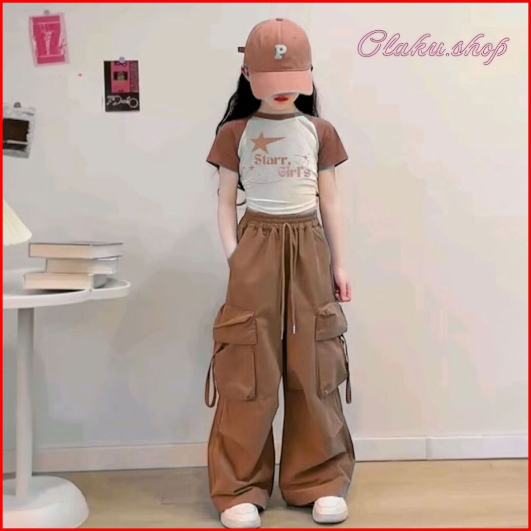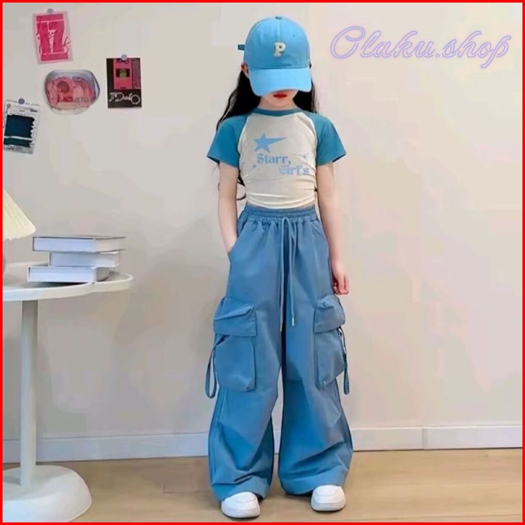One Set Kargo Anak Perempuan Celana Skena Star Girl Usia 1-12 Thn Setelan Anak Perempuan Celana Kargo Dan Kaos Raglan Te