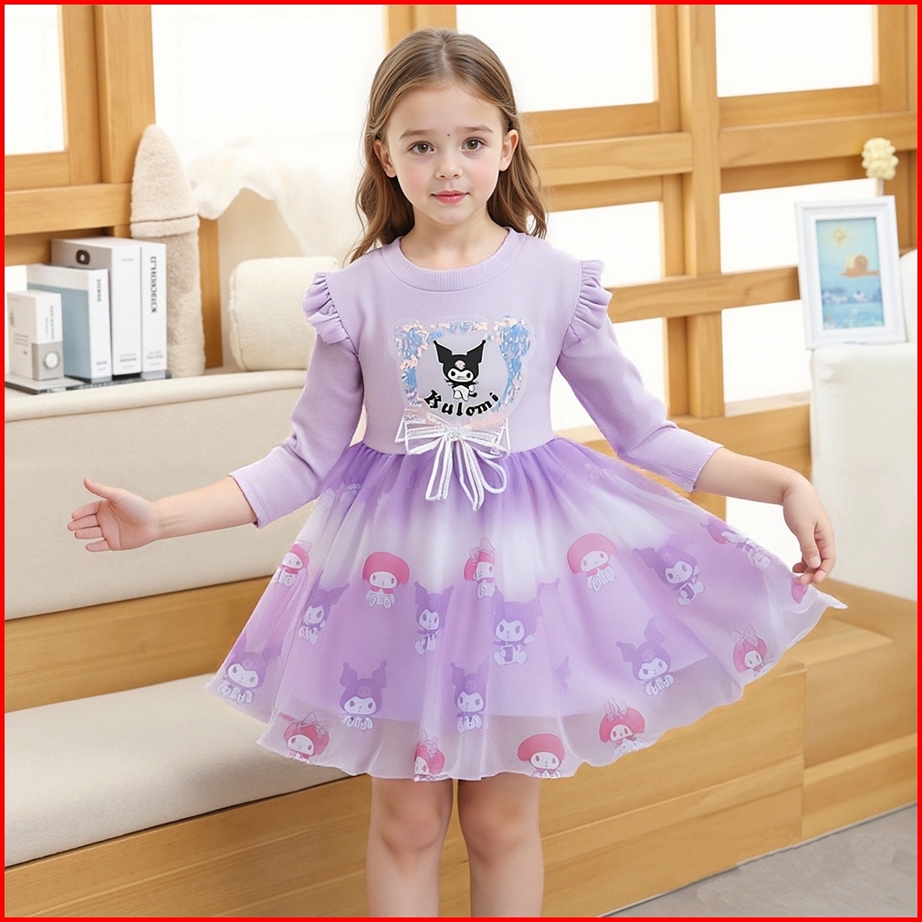 2-7 Tahungaun Putri Kuromi Kartun Lengan Panjang Untuk Anak Perempuan Gaun Katun Kasual Untuk Anak