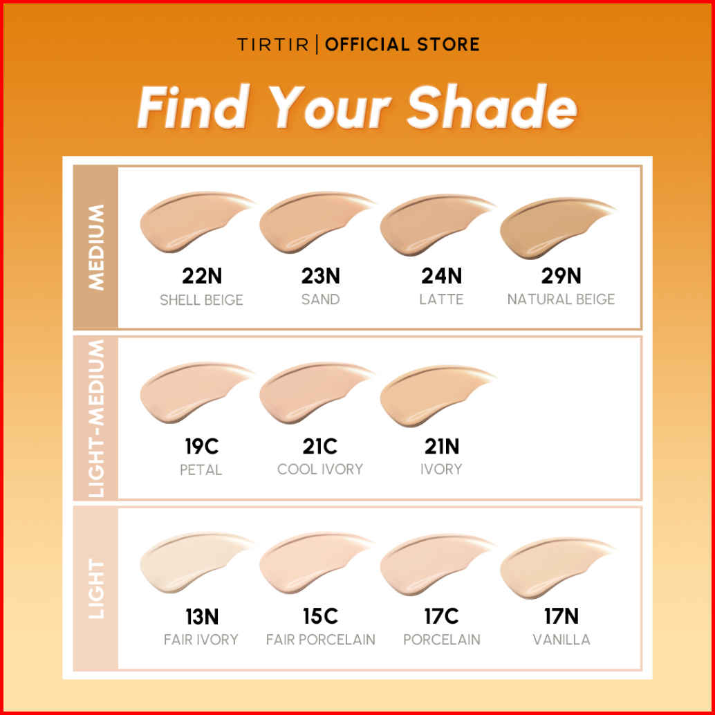 13N Fair Ivory, 15C Fair Porcelain, 17C Porcelain, 17N Vanilla, 19C Petal, 21C Cool Ivory, 21N Ivory, 22N Shell Beige, 23N Sand, 24N Latte, 29N Natural Beige