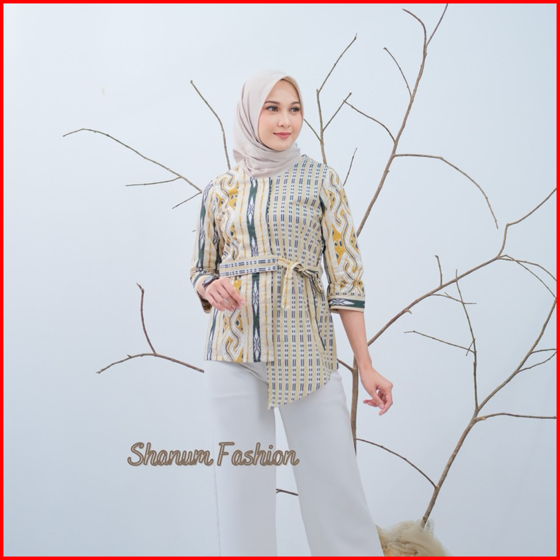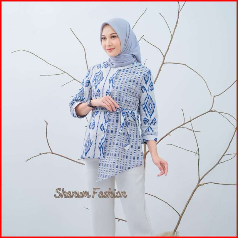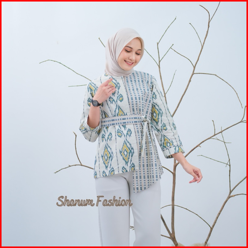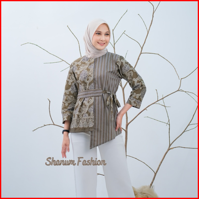 Baju Batik Wanita Lengan Panjang Motif Daun Waru Modern Monalisa Genes Blouse Bahan Katun Basic Asli Pekalongan