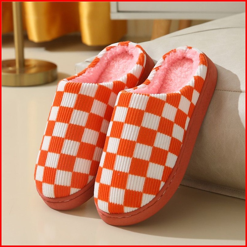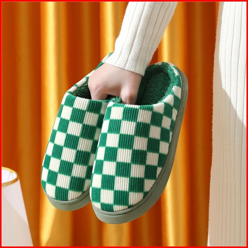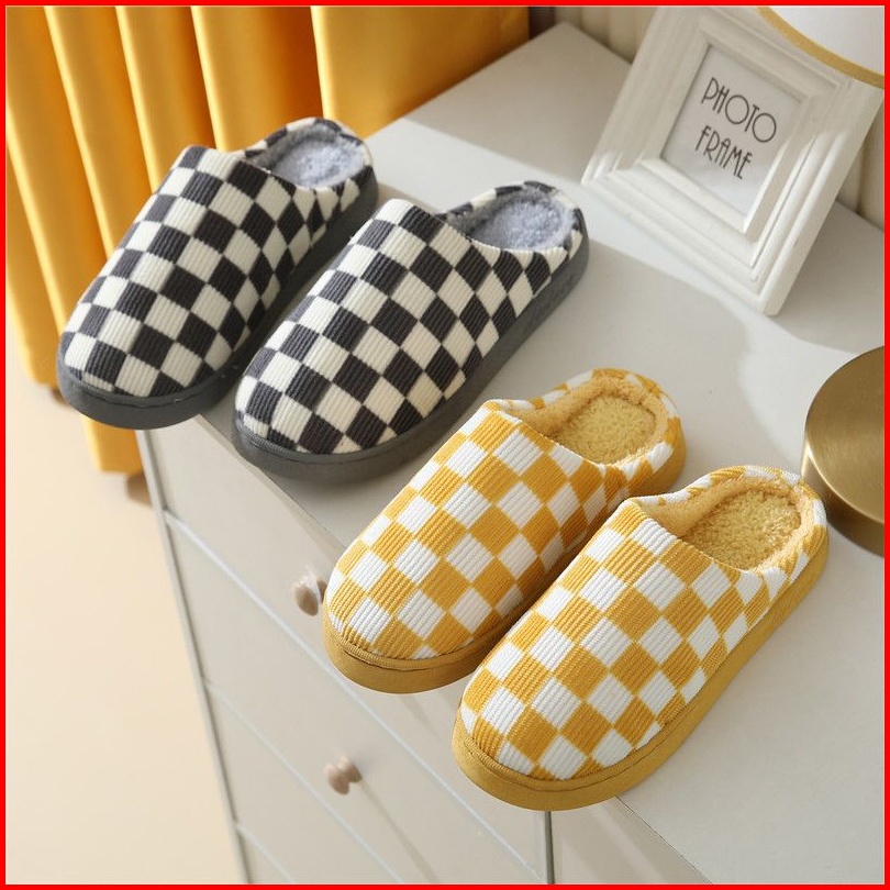 Sandal Rumah Korea Bulu Slip On Checkered Board