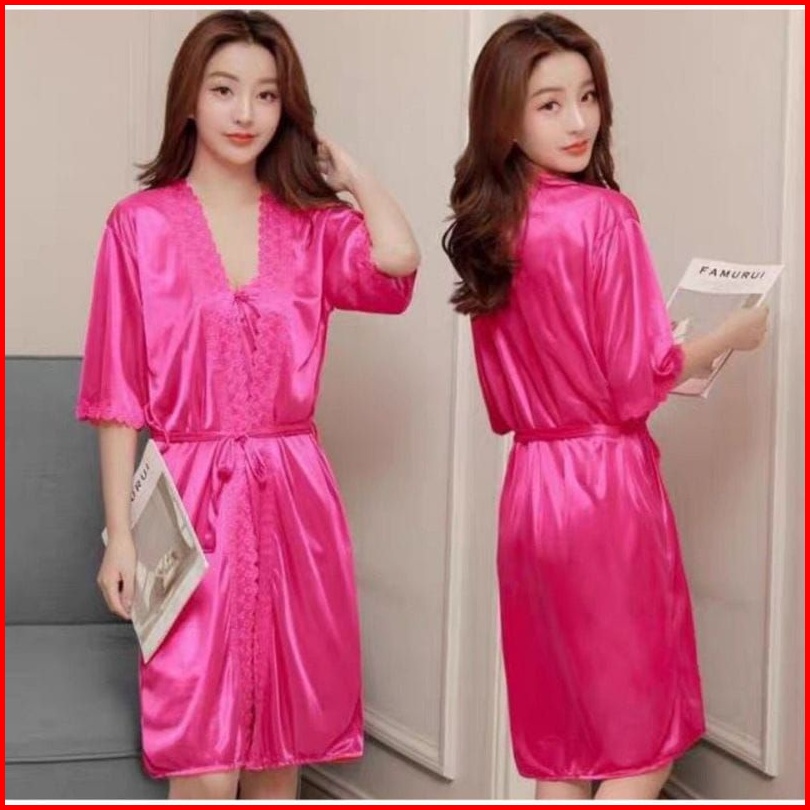 Baju Tidur Wanita Kimono Tricot Set 2in1 Luaran Dan Daleman Lingerie Satin Import Size L Xxl Jumbo