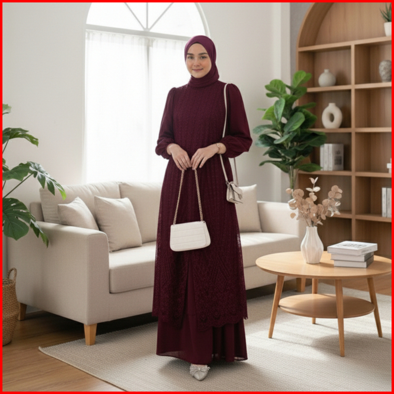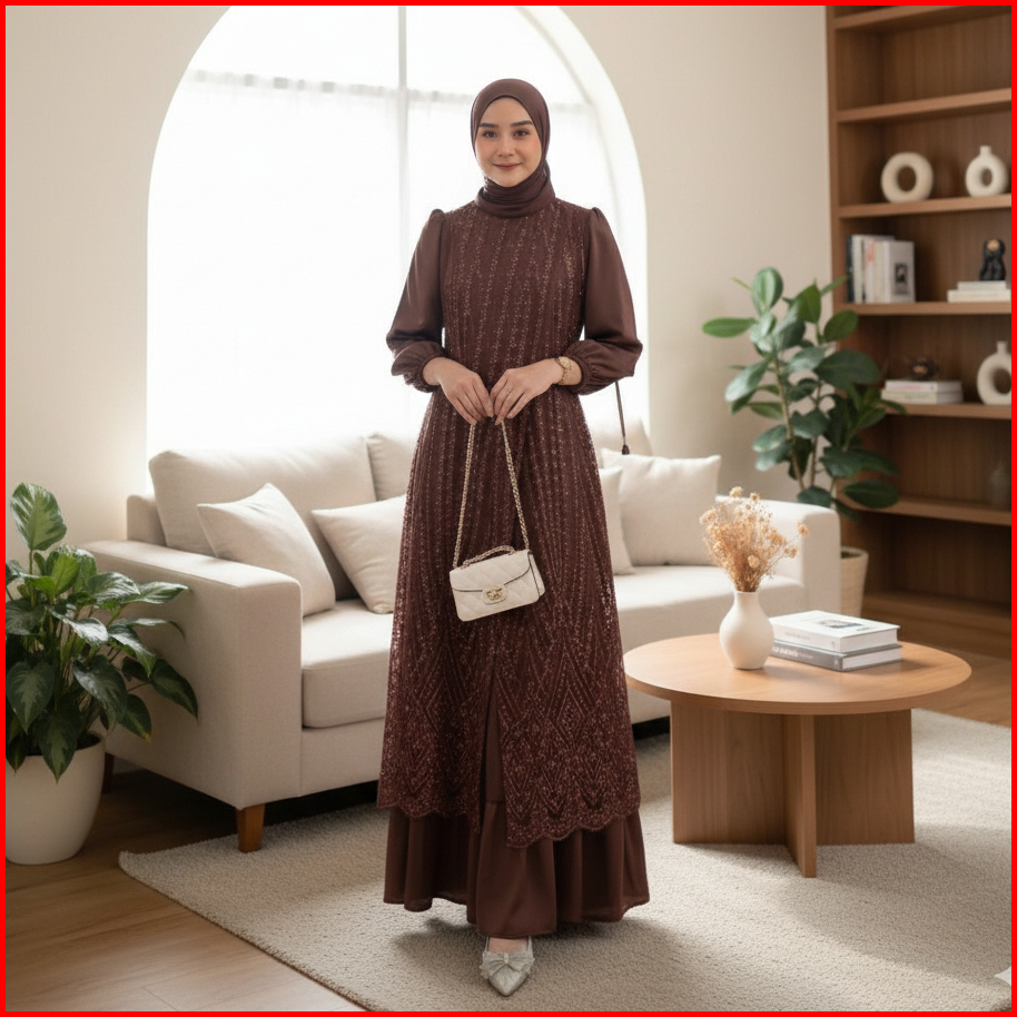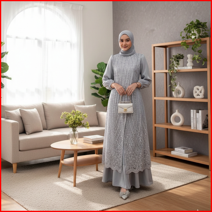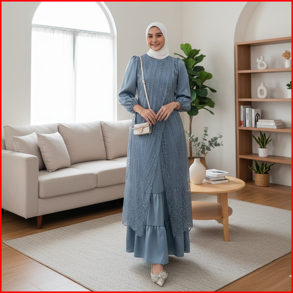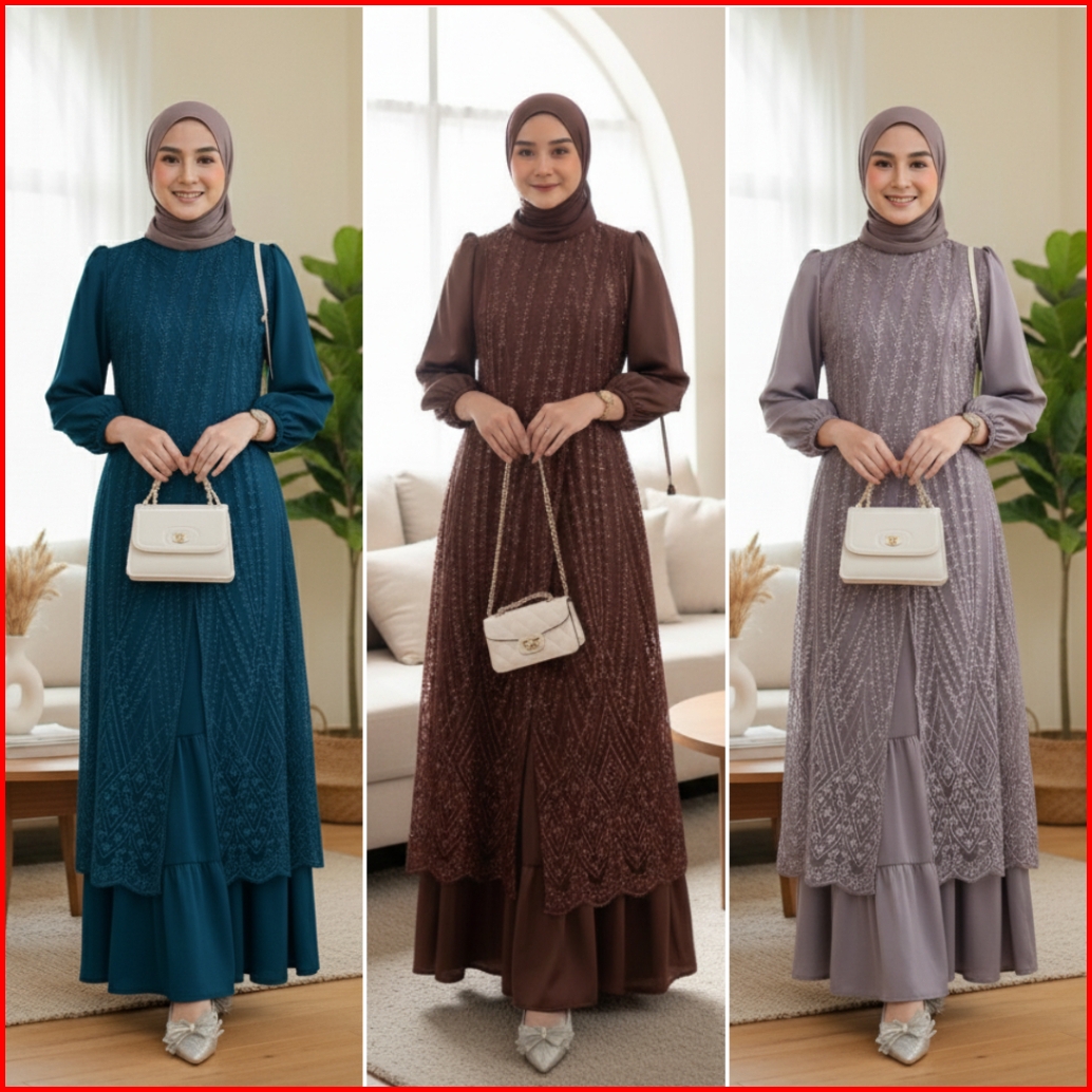 Fuji Dress Pesta Brukat Tille Premium Lebaran Gamis Pesta Mewah Bahan Maxmara Mix Brokat Timbul