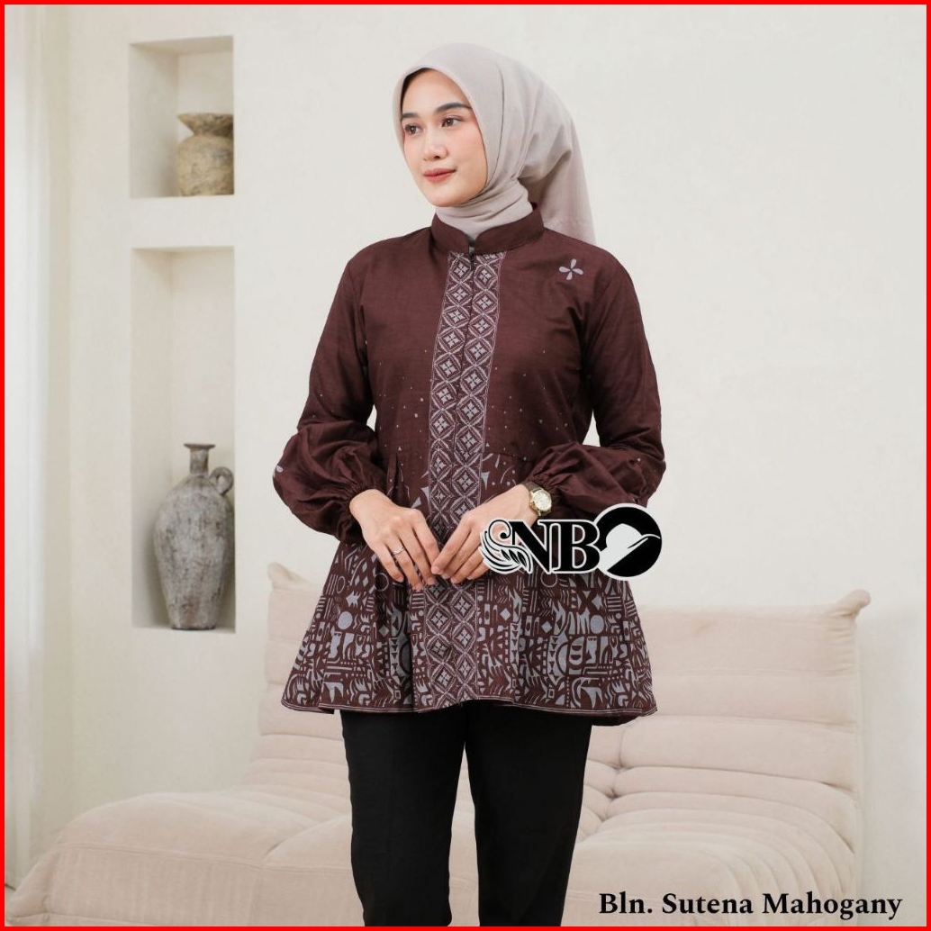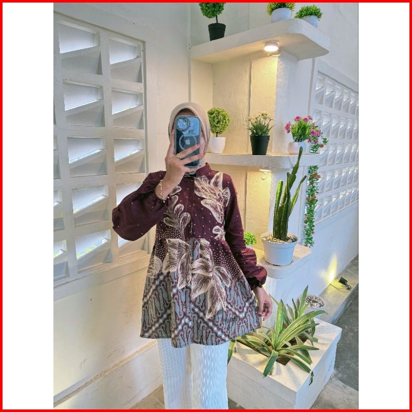 Blouse Batik Wanita Kerja Modern Motif Bunga Lengan Balon