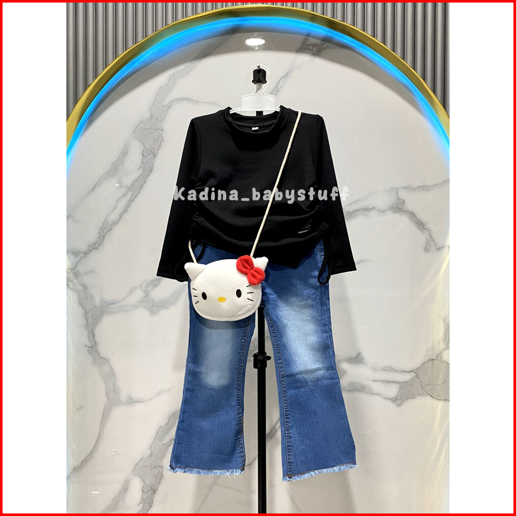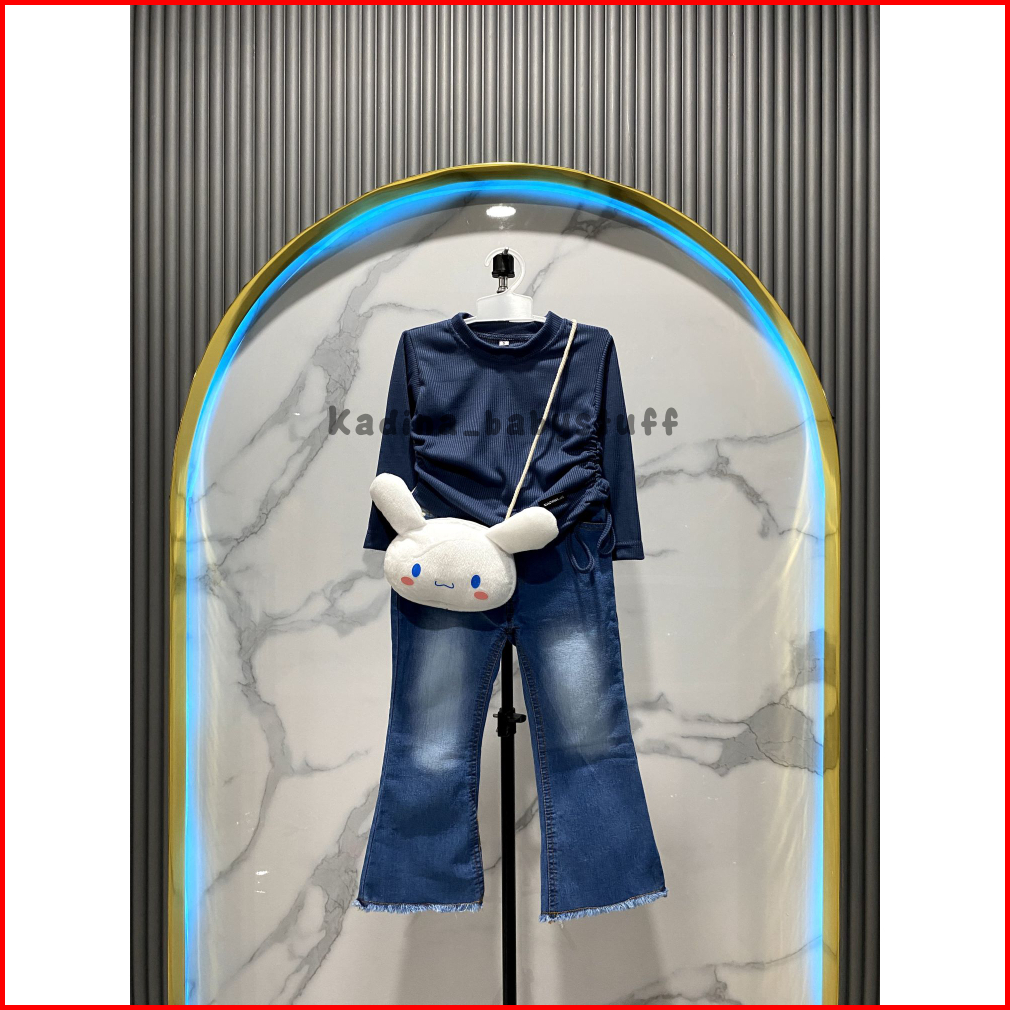 Setelan Anak Perempuan Cutbray Jeans Lightblue Kaos Serut Anak Kekinian Bonus Tas Boneka