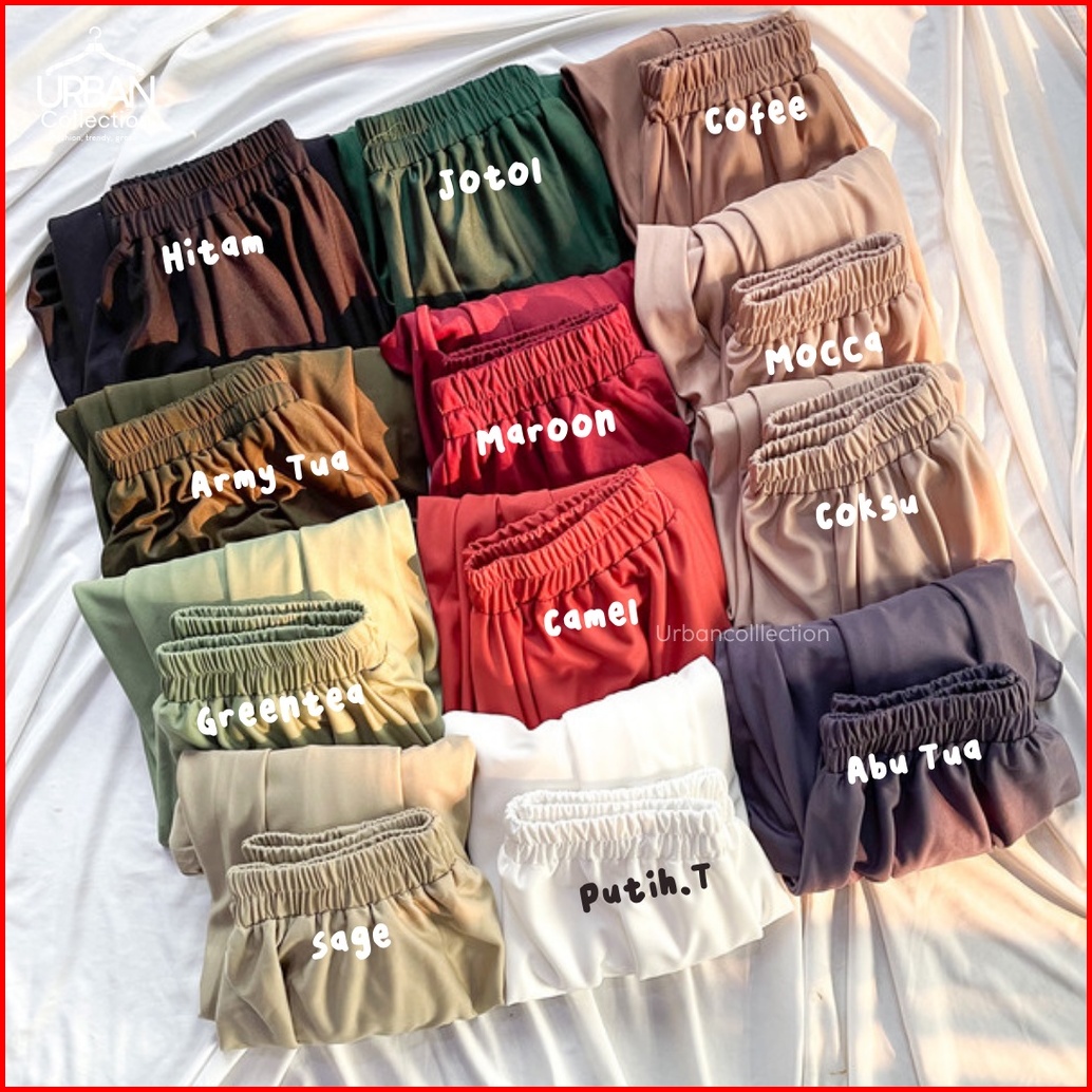 Hitam, Butter, Cream, Putih Tulang, Ivory, Vanilla, Cofee, Khaki, Oat, Coksu, Milo, Mocca, Pramuka, Abu Debu, Choco, Dalgona, Chewsewnut, Abu Silver, Abu Tua, Navy Tua, Navy muda, biru wardah, biru coral, Steel Blue, sky blue, sage tua, Sage, Greentea, Mint, Hijau Botol, Army Tua, Soft Mint, Peach, Dusty Pink, DustyUngu, Magentha, Lilac, Maroon tua, Merah cabe, Orchid, Mustard, Dijon, k. lengkeng, Apricot, Burgundy, Mahogani