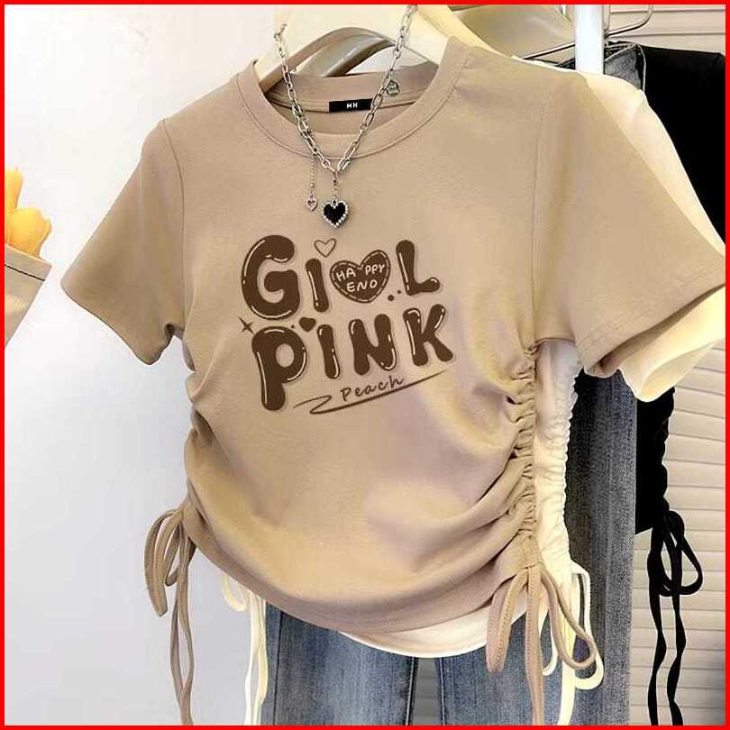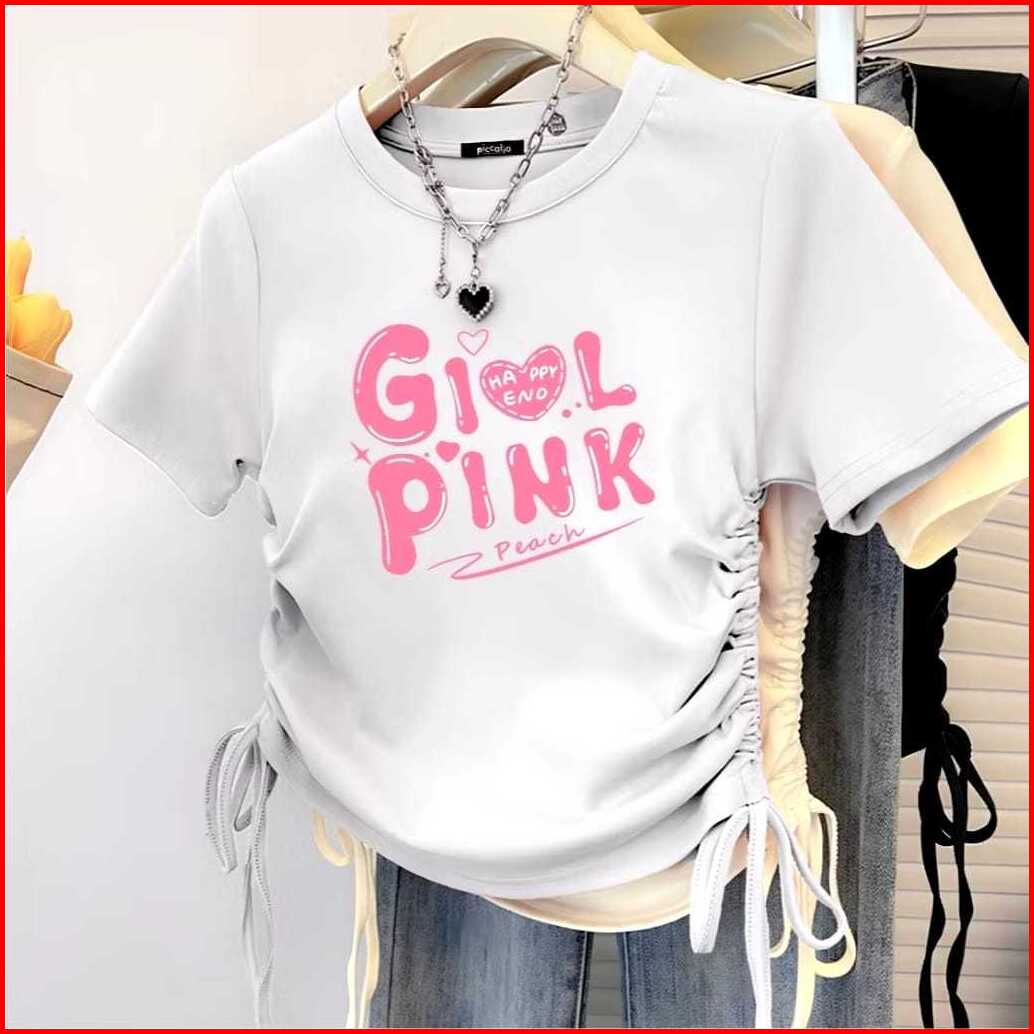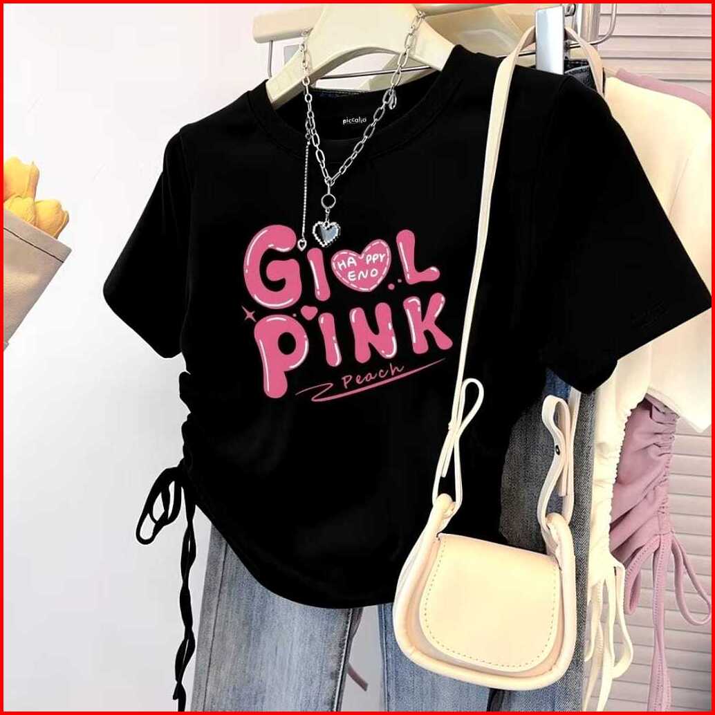 Icalacuk Kaos Crop Wanita Katun - Happy End Love Kaos Serut Tshirt Dewasa Girl Pink