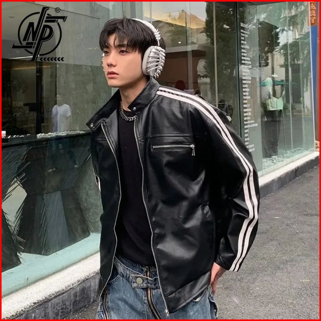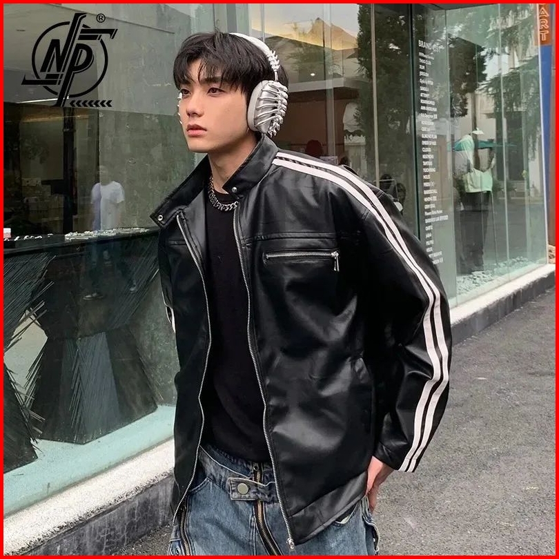 Leather Jaket Motorcycle Jaket Kulit Pria Dan Wanita Strip Oversize