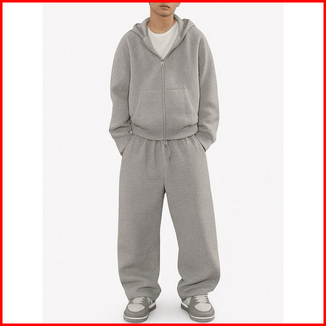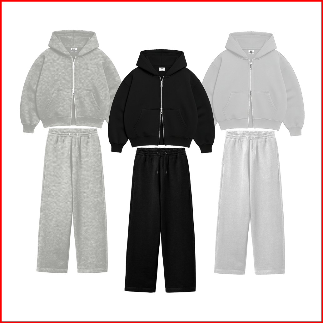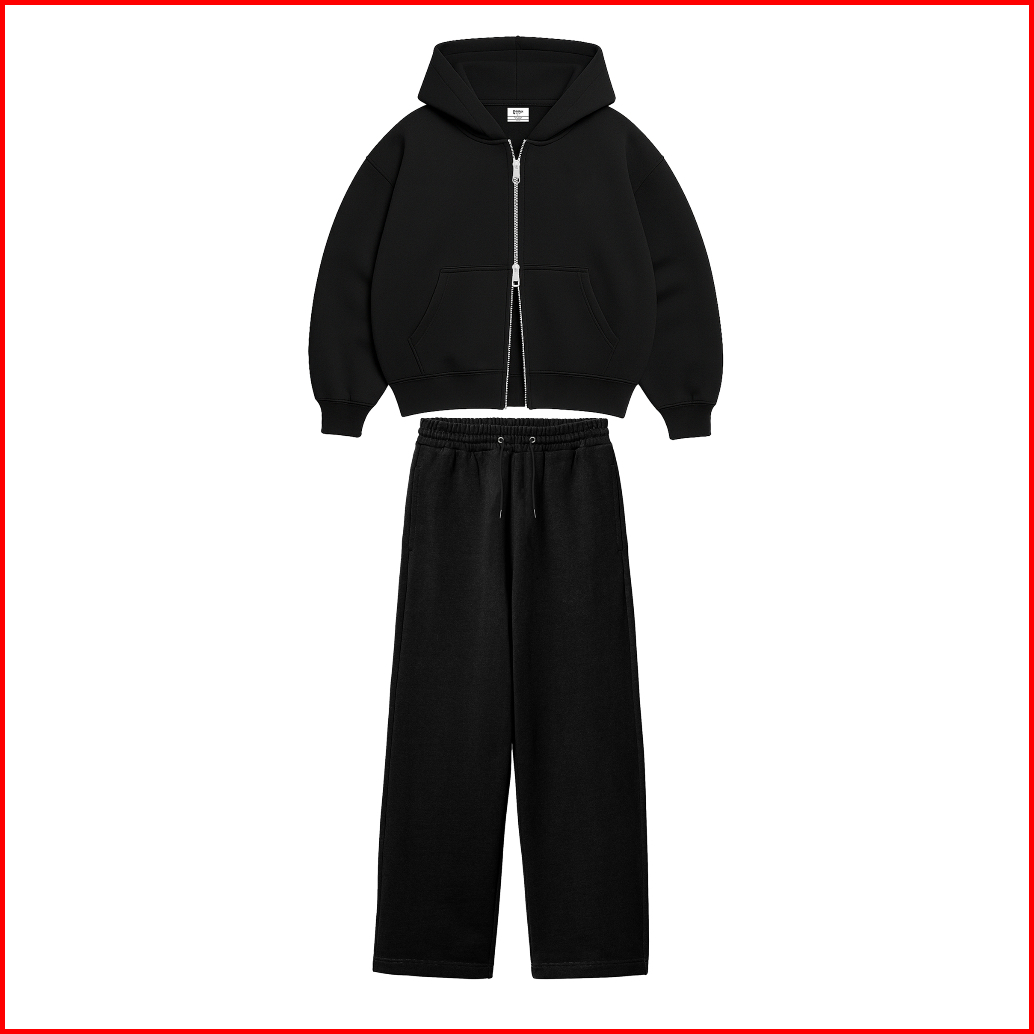 One Set Double Zipper Boxy Hoodie Baggy Sweatpants Basic Fleece