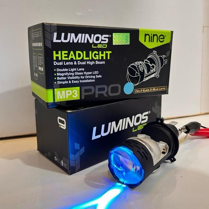 LAMPU LED MINI PROJIE SOKET H4 HEADLAMP MOBIL DAN MOTOR LUMINOS 9 NINE MP3 PRO DENGAN DEVIL EYE DAN BLUE LENS - PUTIH PUTIH DEVIL BLUE