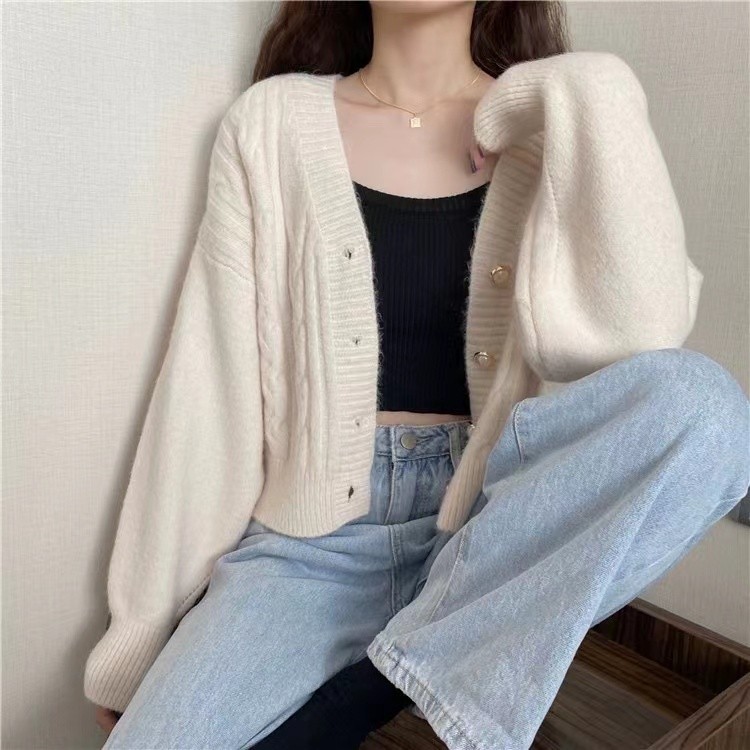 [Star] Cardigan sweter rajutan pelangsing warna solid kerah V modis gaya Korea - QUIRINO