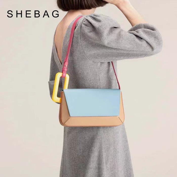 SHEBAG Wanita Kekinian Warna Kontras Tas Sling Bag Wanita Tas Trendi Baru Sambungan Geometris Gesper