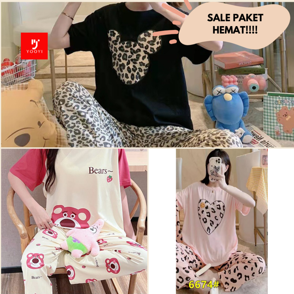 Yooyi Paket Bundle 3 Baju Tidur Wanita Piyama Korea Lengan Pendek Celana Panjang Motif Kartun Lucu Setelan Tidur Murah